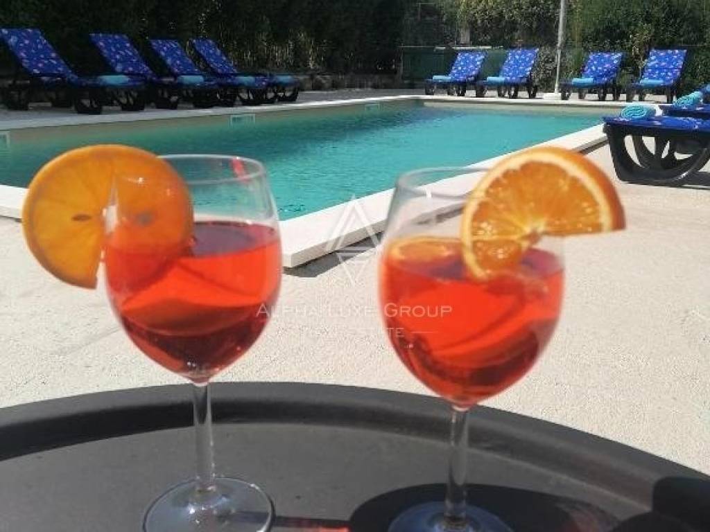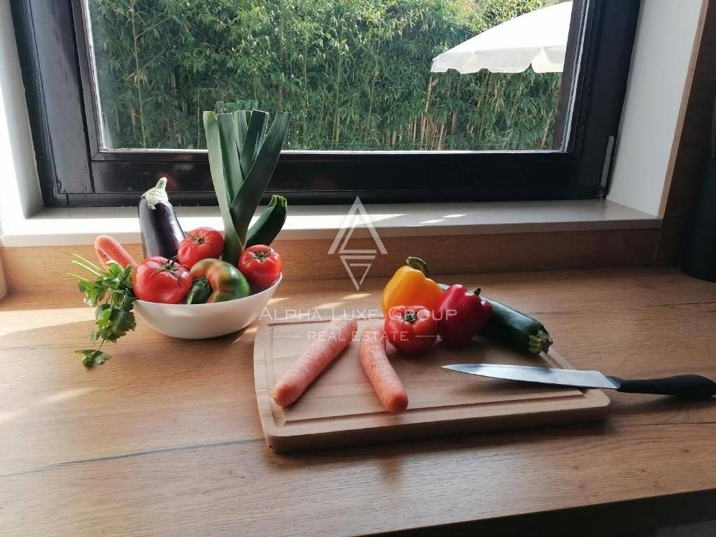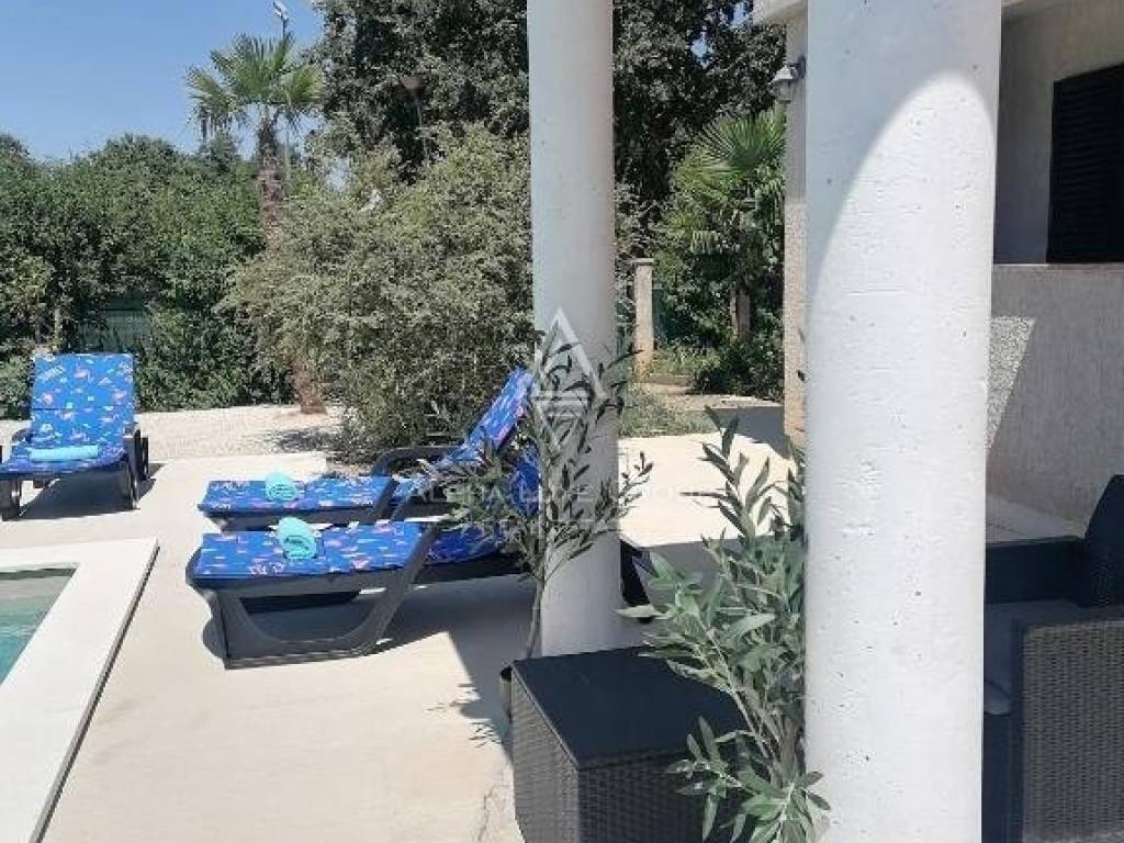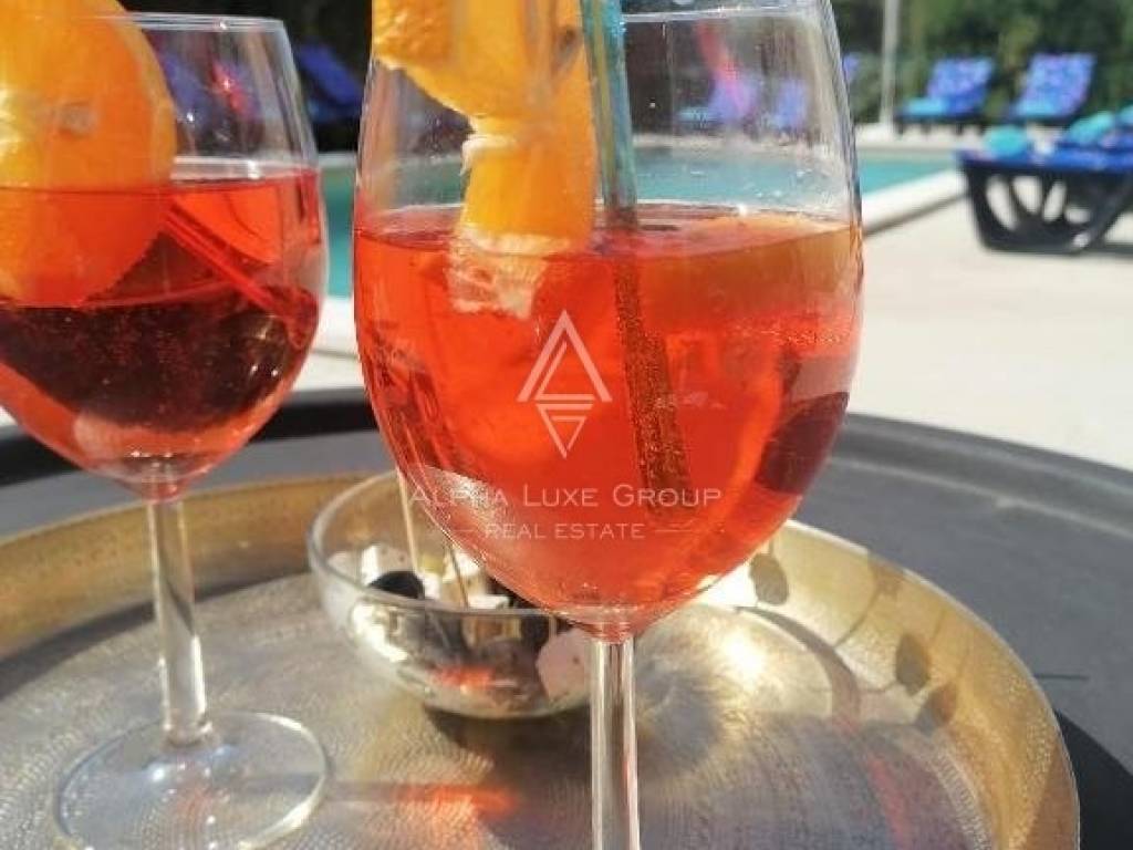 Izvana, predivni bazen od 40 m2 je središnji dio prednjeg dvorišta, okružen sunčalištem i prekrasno uređenim, ograđenim vrtom. Komfor se dodatno pojačava s tri privatna parkirna mjesta. Vila se nudi potpuno namještena i dekorirana, spremna za useljenje.