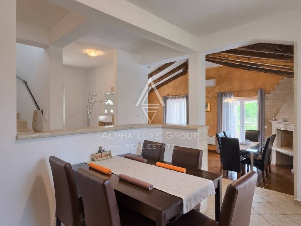 Otkrijte očaravajuću kamenu vilu na slikovitim obroncima Poreča, Istrije, koja prikazuje klasični istarski stil s prepoznatljivim plavim kapcima. Ova privlačna nekretnina spaja tradicionalni šarm s pažljivo uređenim interijerom, nudeći modernu udobnost u ugodnom, domaćem okruženju.