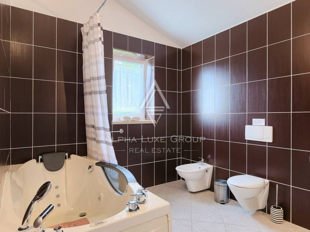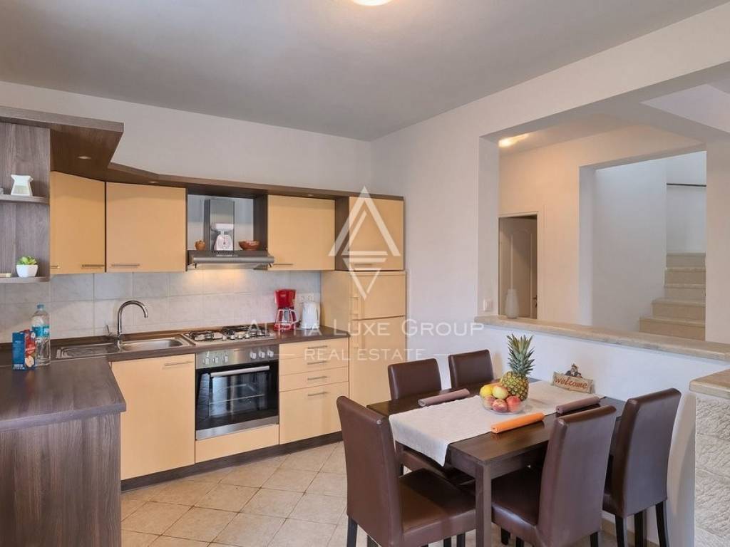 Protežući se na 145 m2 na dva kata, vila sadrži prostrani prizemlje s dnevnim i blagovaonskim prostorom, povezanom kuhinjom s izravnim pristupom dvorištu, jednom spavaćom sobom, kupaonicom i spremištem. Dnevni i blagovaonski prostor otvaraju se na natkrivenu terasu s pogledom na bazen i njegovani vrt. Kamene stepenice vode na prvi kat gdje vas čekaju dvije dodatne prostrane spavaće sobe, jedna s vlastitom kupaonicom, uz još jednu odvojenu kupaonicu. Klimatizacija osigurava ugodna ljeta, dok zidni električni regulatori pružaju grijanje.