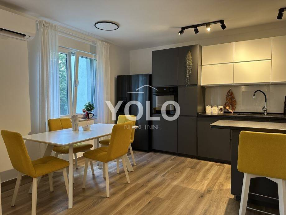 Stan je površine 72m2 i sastoji se od dvije sobe, hodnika, kupaonice, zasebnog wc-a, kuhinje s blagovaonicom i dnevnim boravkom, balkon, ostava.