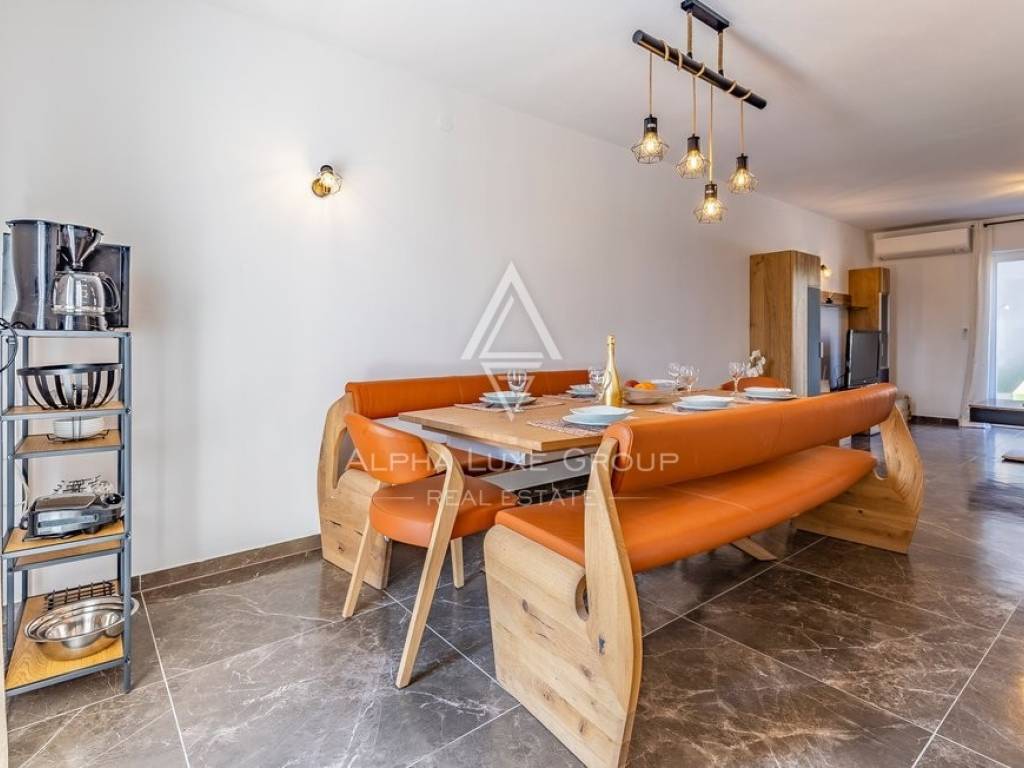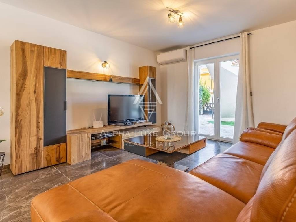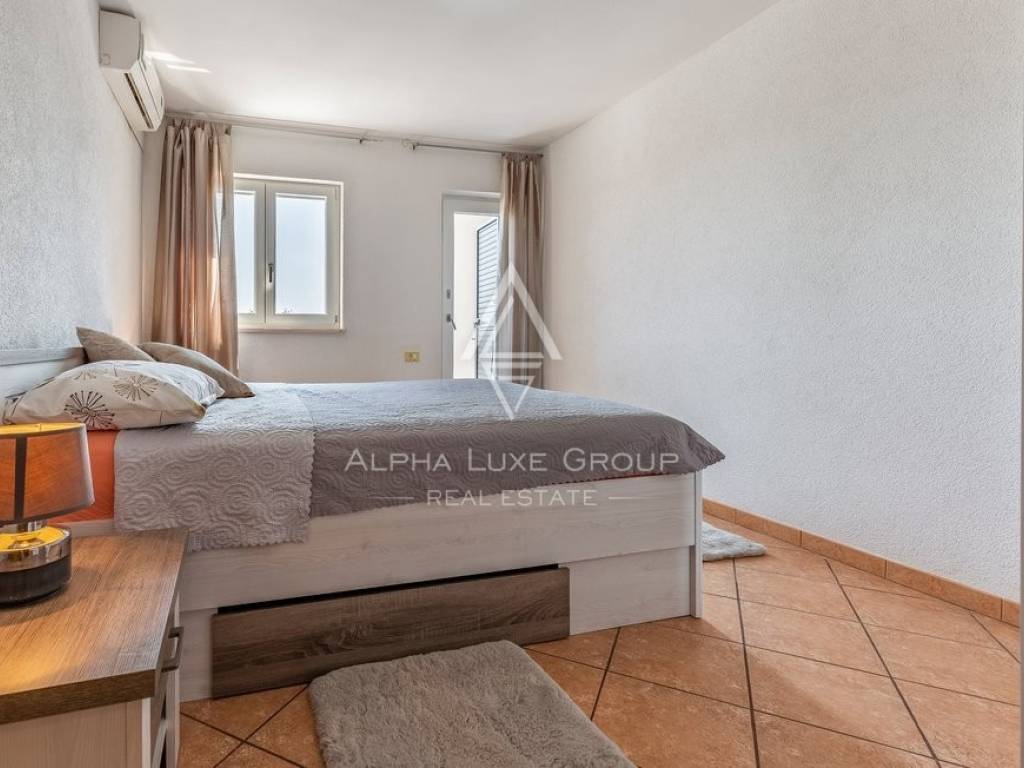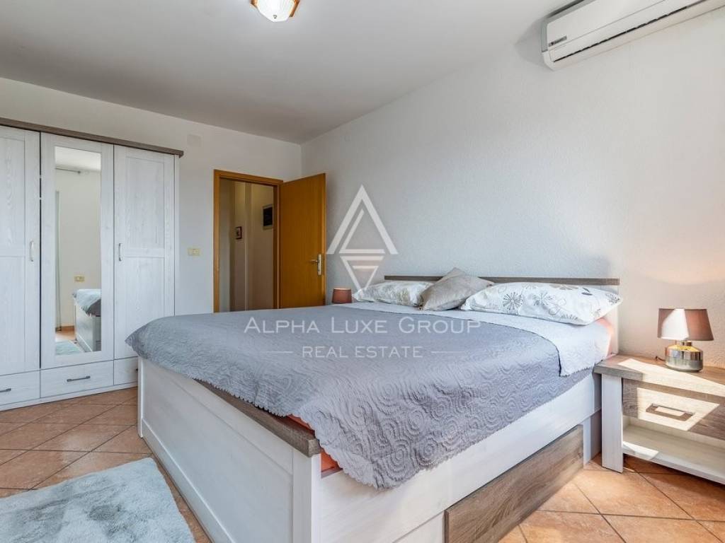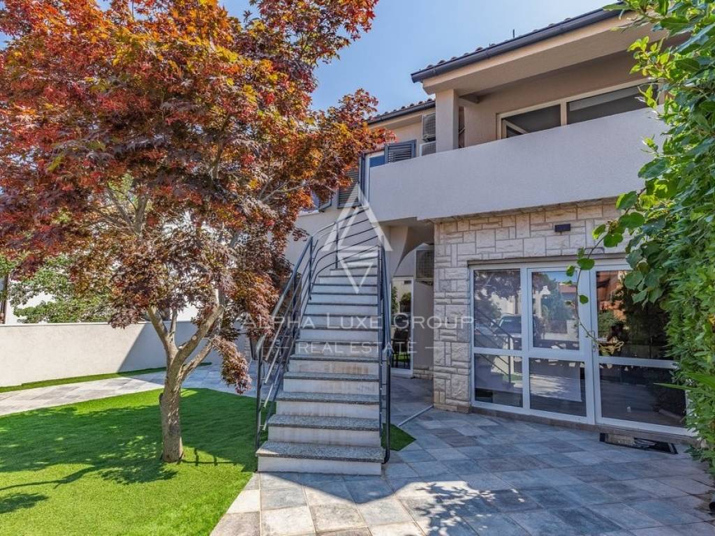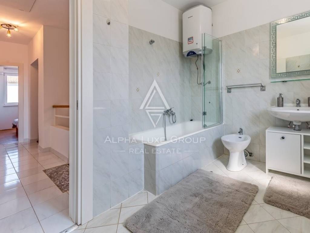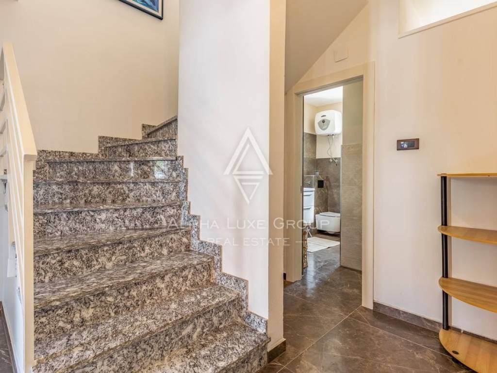Rezidencija je jedinstveno dostupna s dvije strane, nudeći jedno parkirno mjesto unutar dvorišta i dodatne mogućnosti parkiranja ispred. Vanjski prostor obogaćen je grijanim bazenom od 32m2, prostorom za roštilj, vanjskim tušem i WC-om, savršenim za odmor i zabavu. Prodaje se potpuno namještena, spremna za odmah useljenje.