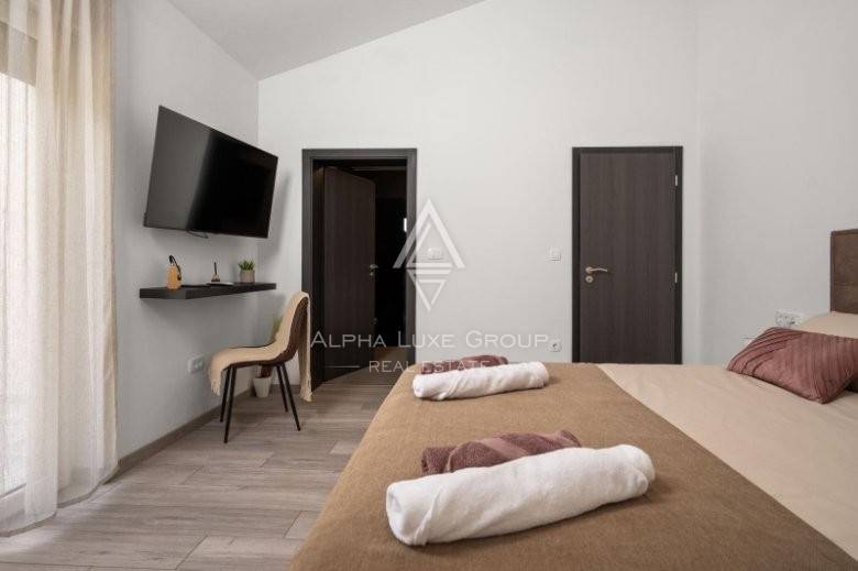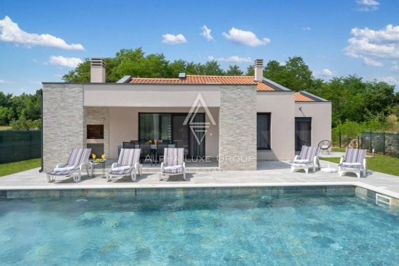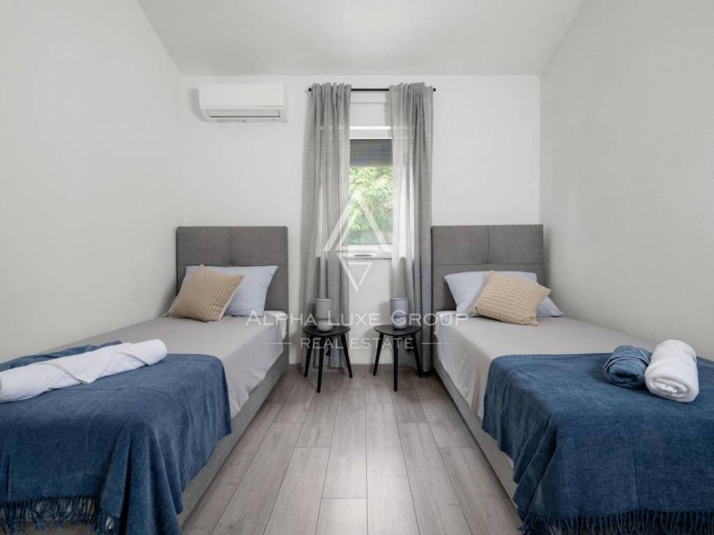 Dizajnirana s naglaskom na suvremenu estetiku i kvalitetne materijale, ova nekretnina zadovoljava standarde od četiri zvjezdice, što je čini idealnom investicijom s visokim potencijalom povrata. Sve sobe su klimatizirane, pružajući cjelogodišnju udobnost. Ograđeno dvorište nudi dovoljno parkirnih mjesta i jednostavan pristup, dok je terasa oko bazena elegantno popločana i osvijetljena za večernje uživanje, s bujnom zelenom travom koja okružuje prostor.