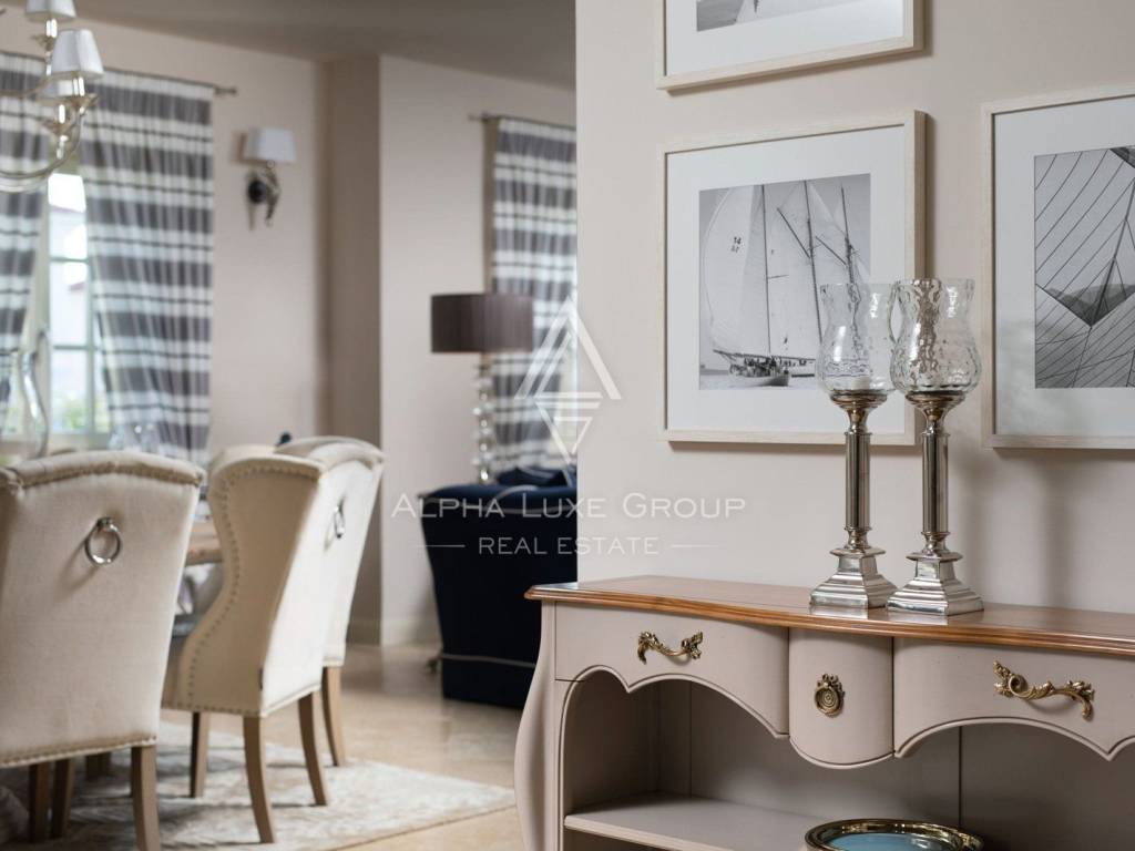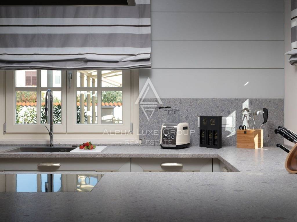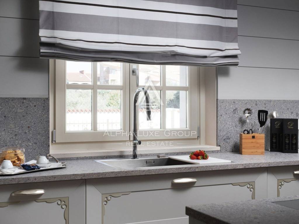 Ulaz u vilu oduševljava svjetski poznatim mramorom, uključujući Crema Imperial i Emperador Dark Licido, koji vode u prostrani hodnik s ugrađenim ormarom. U prizemlju se nalazi elegantan dnevni boravak ukrašen dizajnerskim detaljima i luksuznim zavjesama Dedar Milan, dok moderna kuhinja ima vrhunsku opremu renomiranih svjetskih proizvođača. Besprijekoran raspored idealan je za druženja i zabave.