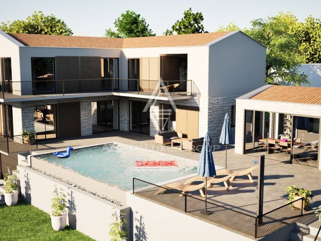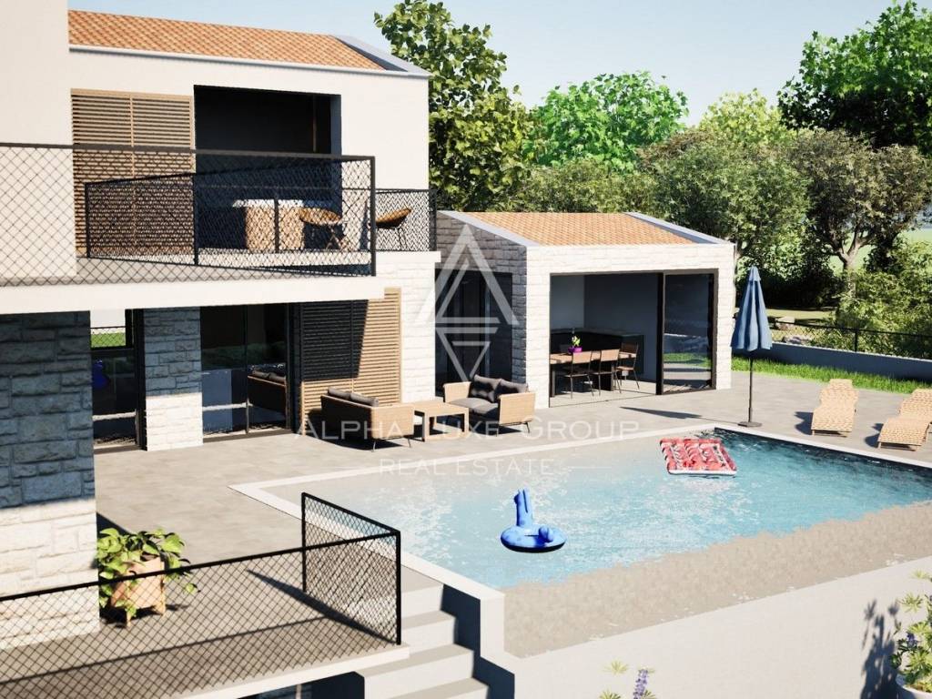 Vanjski prostor jednako je impresivan, s bazenom od 40 m², ljetnom kuhinjom od 23,36 m² s toaletom i dovoljno parkirnih mjesta. Vila je opremljena podnim grijanjem putem klimatizacijskog sustava, dok su napravljene pripreme za fotonaponsku elektranu i punjač za električne automobile. Grijanje vode osigurava toplinska pumpa, a PVC stolarija s trostrukim staklima pruža optimalnu izolaciju.