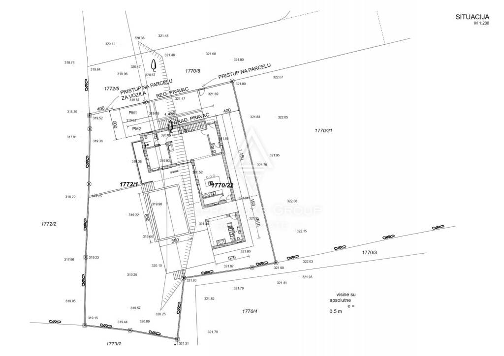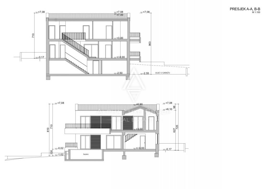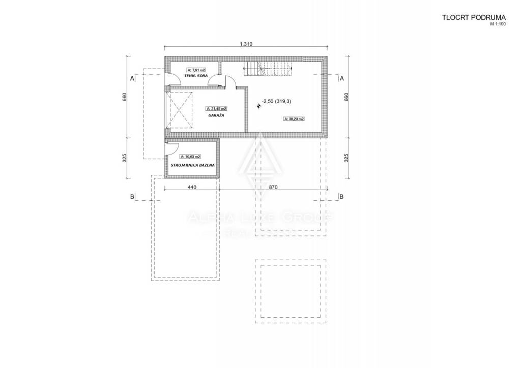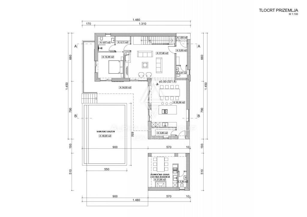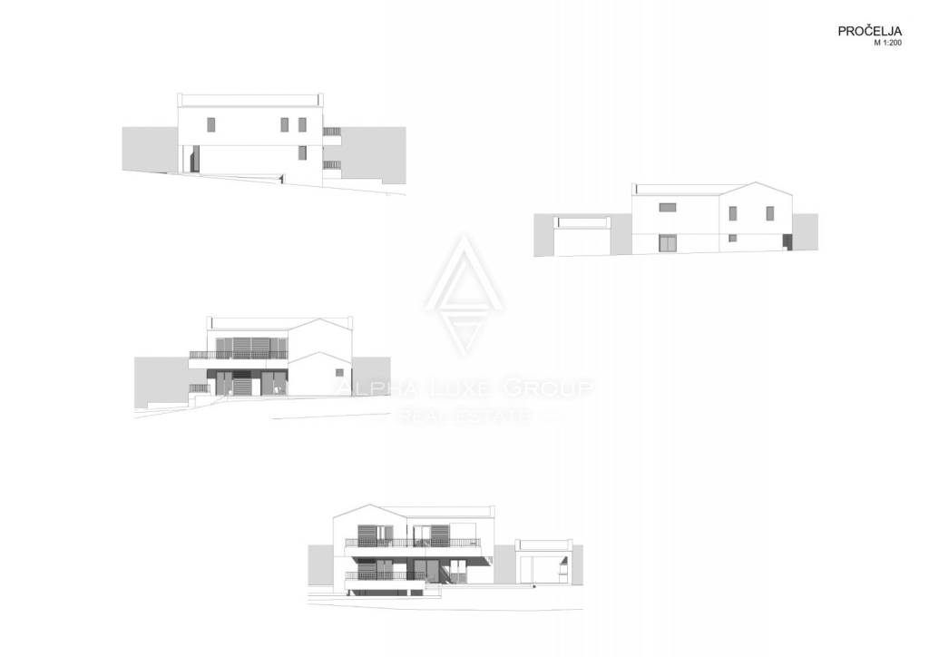U polu-suterenu se nalaze garaža, tehnička soba, strojarnica za bazen, toalet i prostrana prostorija namijenjena za rekreaciju, idealna za biljar ili wellness sa saunom ili fitnessom. Unutarnje stepenice vode u prizemlje, koje uključuje ulazni hodnik, svijetli dnevni boravak, blagovaonicu, modernu kuhinju, spavaću sobu s vlastitom kupaonicom i gostinjski toalet. Sve prostorije imaju izlaz na prostranu terasu od 34,03 m² i uređeni vrt.