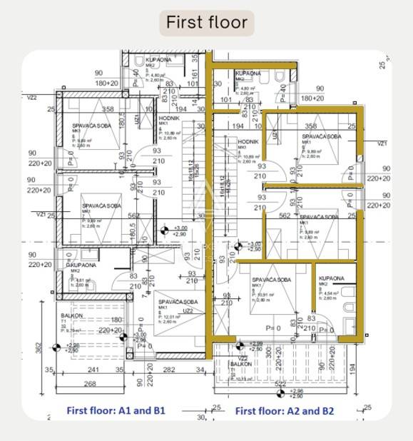 Kuća se prostire na tri etaže. Prizemlje površine 63,47 m² uključuje open-space kuhinju, blagovaonicu, dnevni boravak (50,70 m²), toalet (2,64 m²) te izlaz na natkrivenu terasu od 10,13 m² i uređeni vrt. Prvi kat (61,05 m²) sadrži tri spavaće sobe – Spavaća soba 1 (10,91 m²) ima vlastitu kupaonicu i izlaz na balkon s pogledom na more (10,13 m²), dok Spavaće sobe 2 i 3 (po 9,89 m²) dijele modernu kupaonicu (4,54 m²). Hodnik (10,89 m²) povezuje sve prostorije uz dodatnu kupaonicu (4,80 m²).