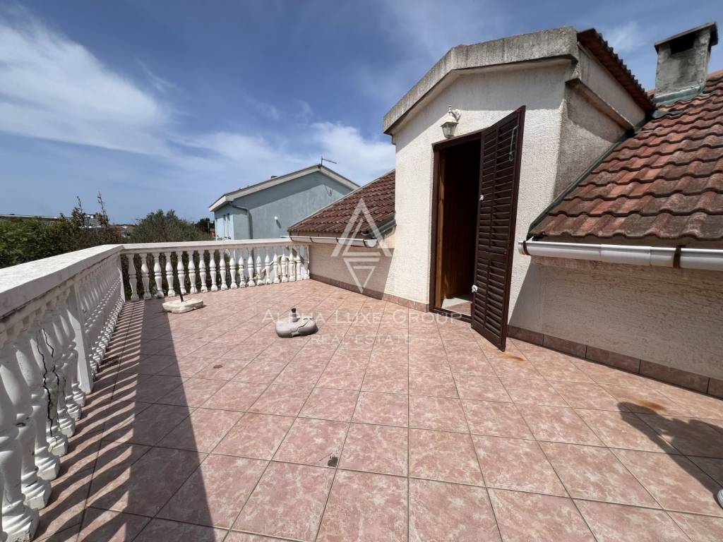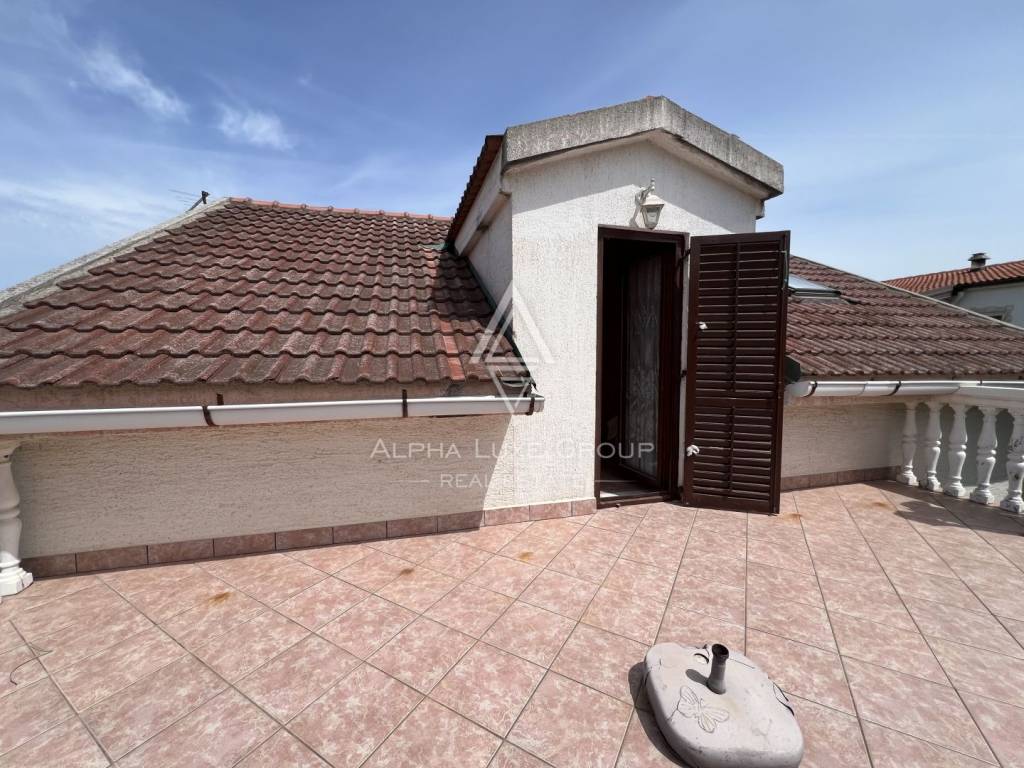 Vanjsko stubište vodi do prostranog apartmana u potkrovlju, koji se sastoji od velikog dnevnog boravka s kompaktnom kuhinjom, blagovaonice i kupaonice. Dodatna soba može služiti kao gostinjska soba, ured ili prostor za opuštanje. Ova etaža izlazi na veliku privatnu terasu, idealnu za uživanje u mediteranskoj klimi.