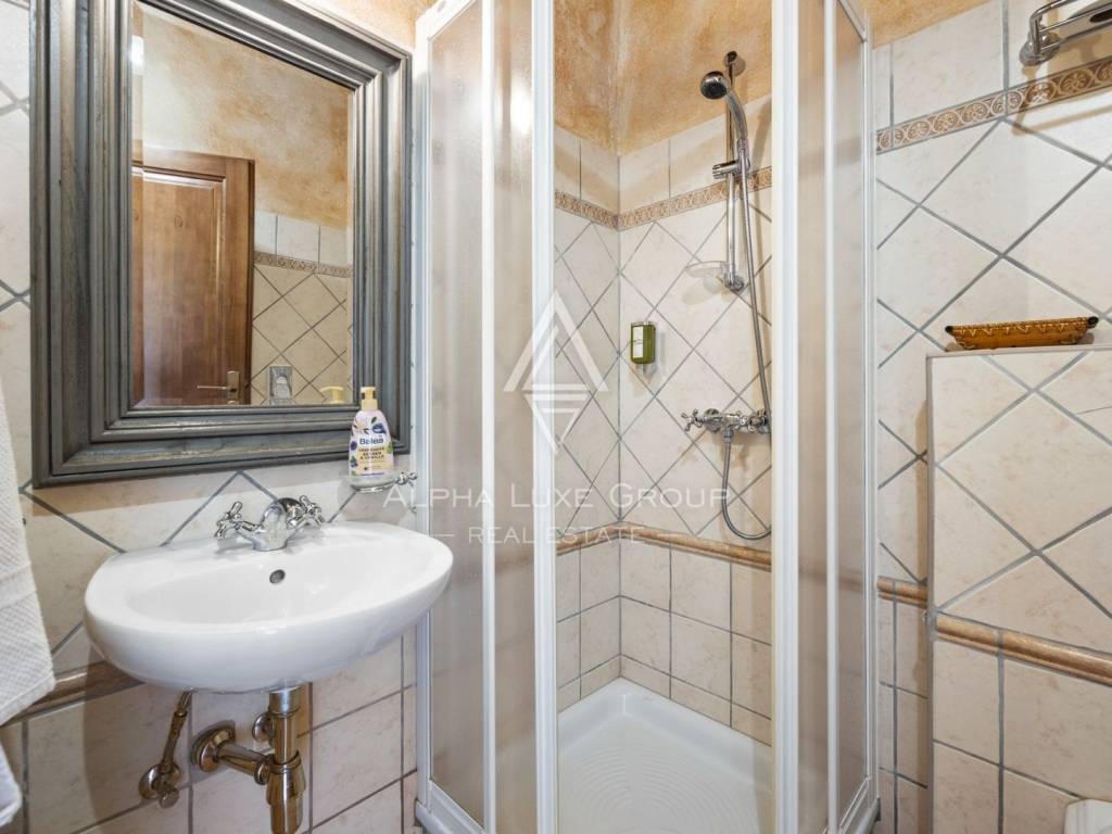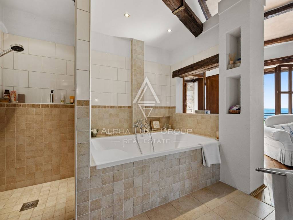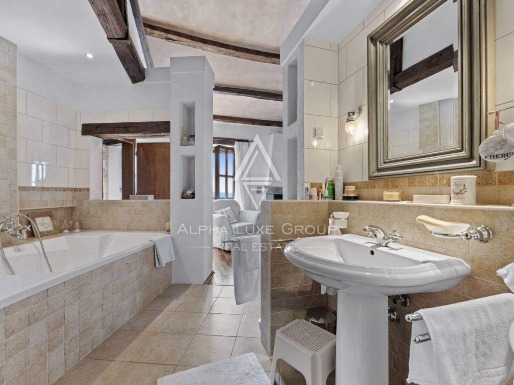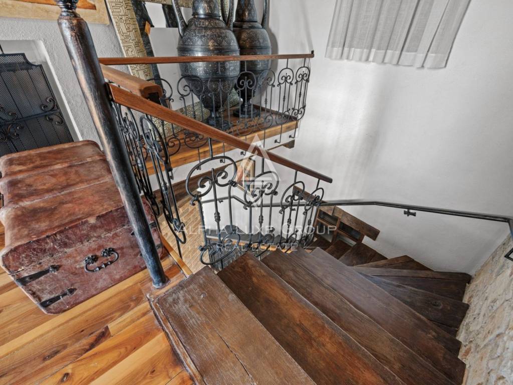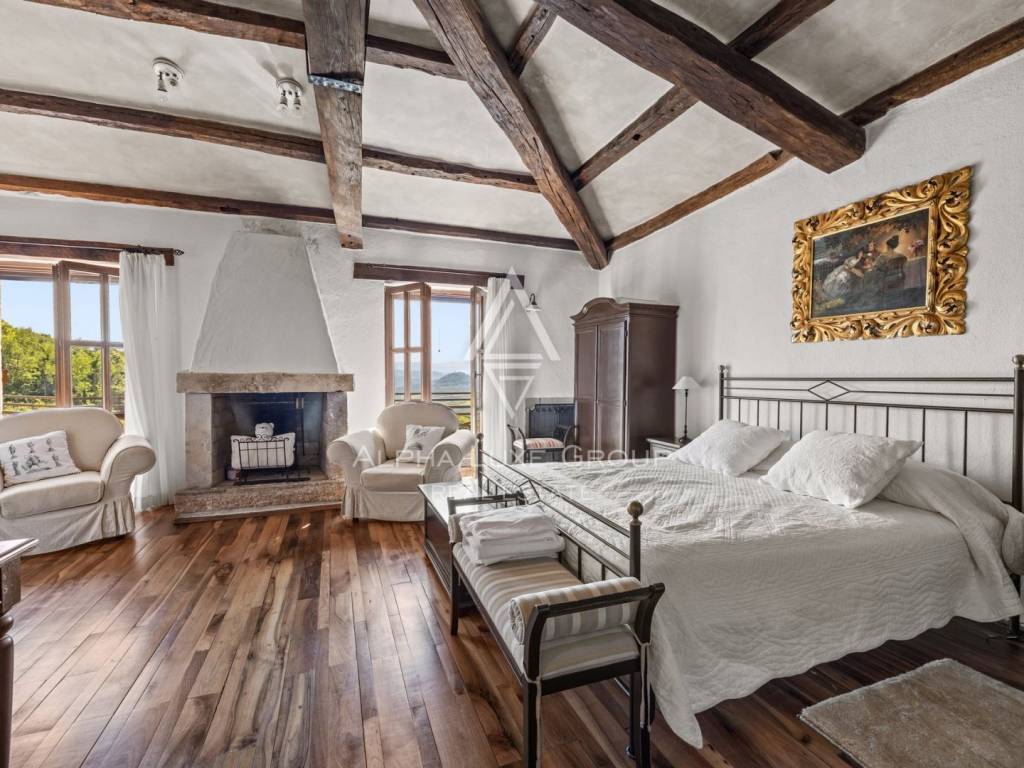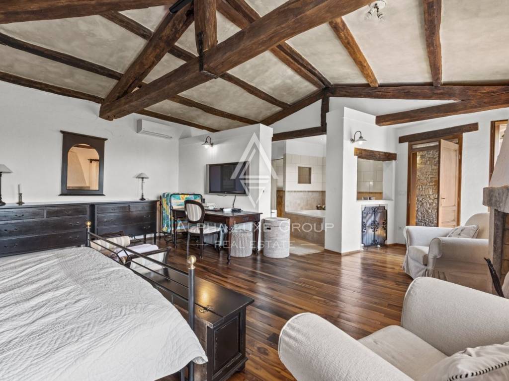 Unutarnjim stepenicama se dolazi do kata na kojem se nalazi otmjeno uređena i opremljena radna soba te prostrana spavaća soba sa otvorenom kupaonom i odvojenim toaletom. Ova master spavaća soba ima i kamin u kojem možete uživati u hladnim zimskim večerima te također i izlaz na terasu s koje se pruža predivan pogled.