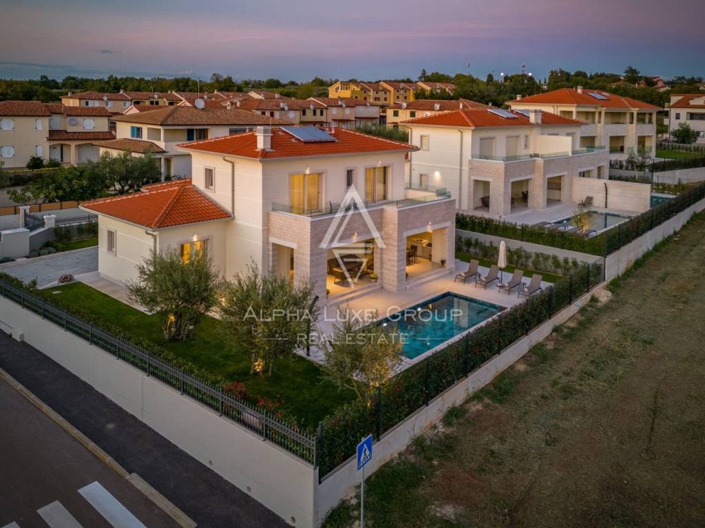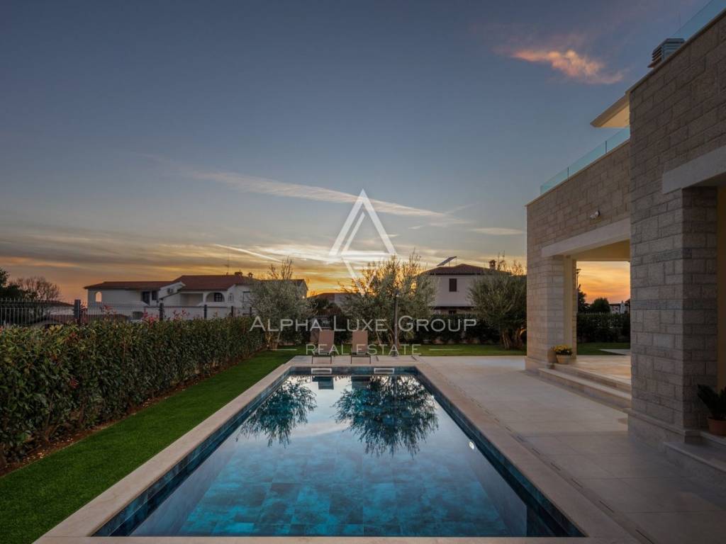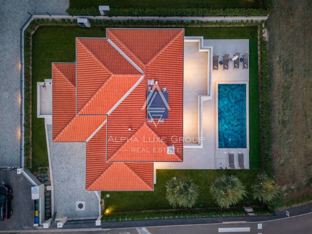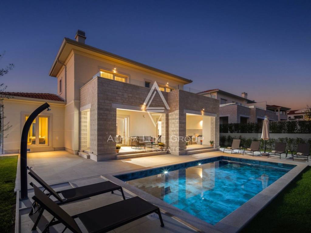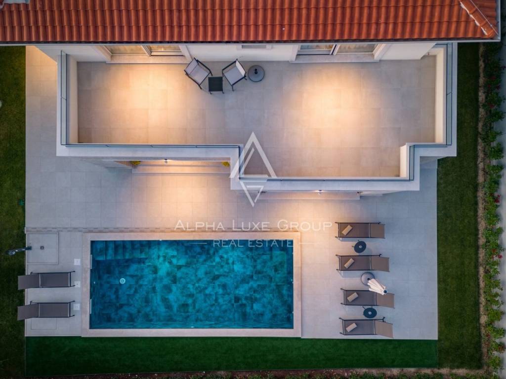 Ova dvokatna vila nudi raskošan dnevni boravak, modernu kuhinju, blagovaonicu, ostavu, i gostinjski WC sve u prizemlju. Iz dnevnog boravka se izlazi na vanjsku terasu s ljetnom kuhinjom, koja vodi do vrta s grijanim bazenom i automatskim sustavom za navodnjavanje okućnice.