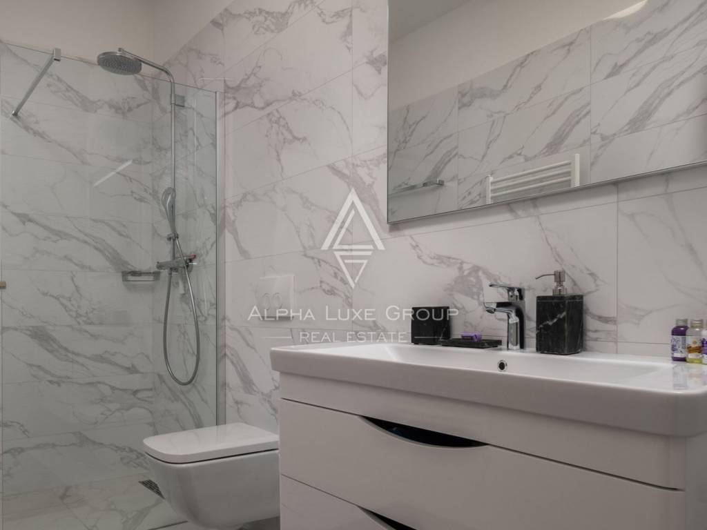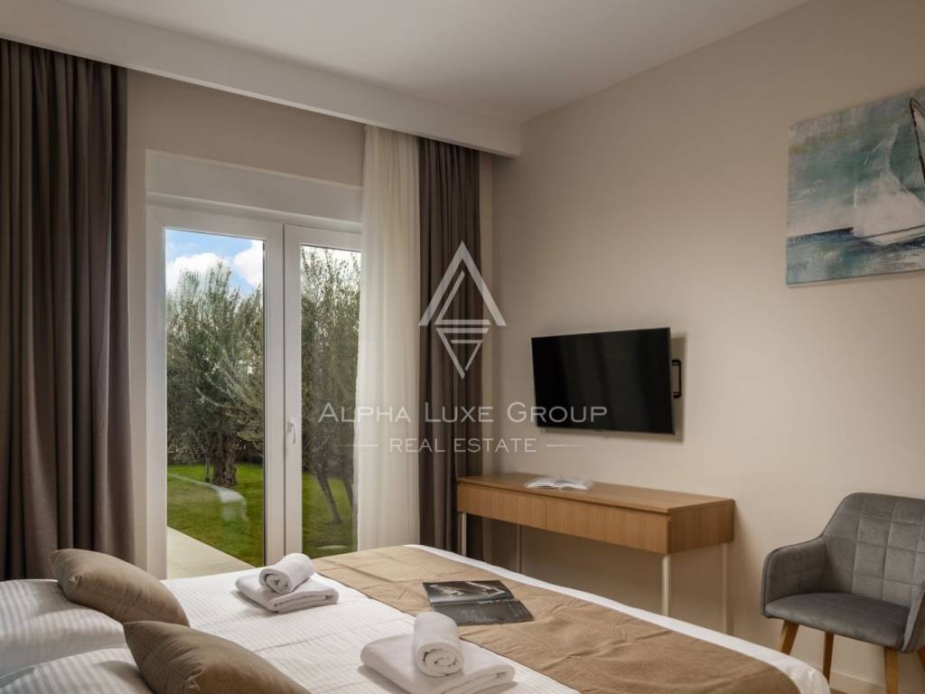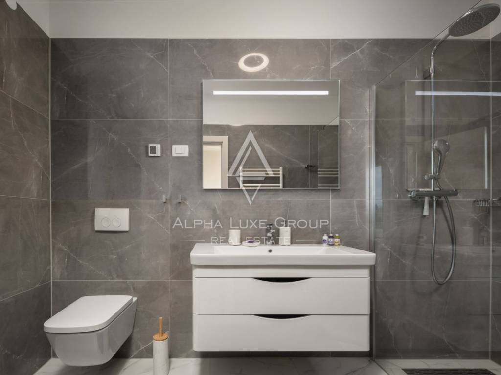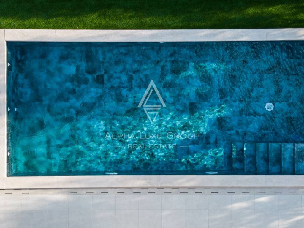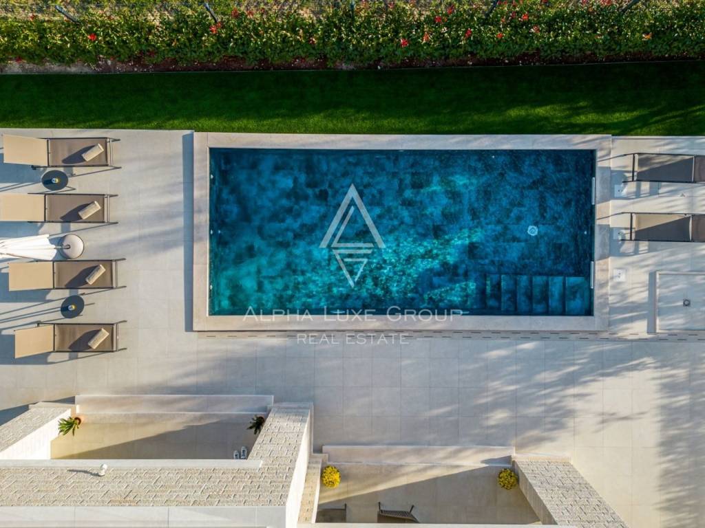 Ova dvokatna vila nudi raskošan dnevni boravak, modernu kuhinju, blagovaonicu, ostavu, i gostinjski WC sve u prizemlju. Iz dnevnog boravka se izlazi na vanjsku terasu s ljetnom kuhinjom, koja vodi do vrta s grijanim bazenom i automatskim sustavom za navodnjavanje okućnice.