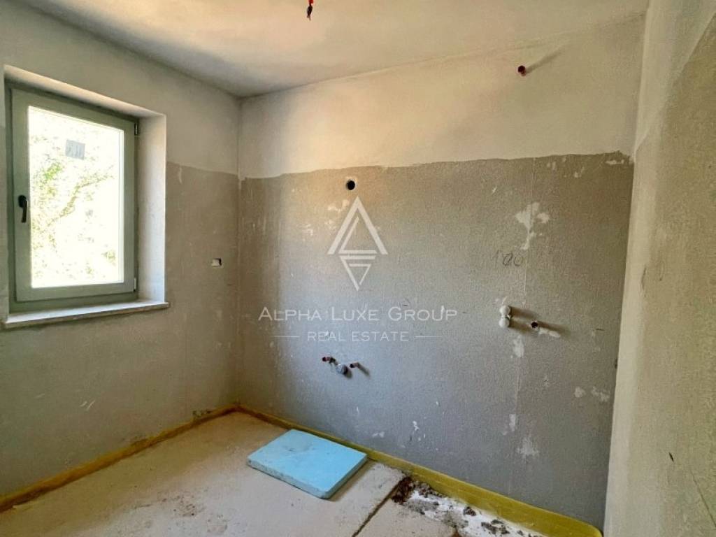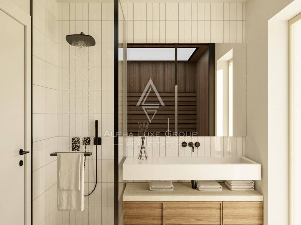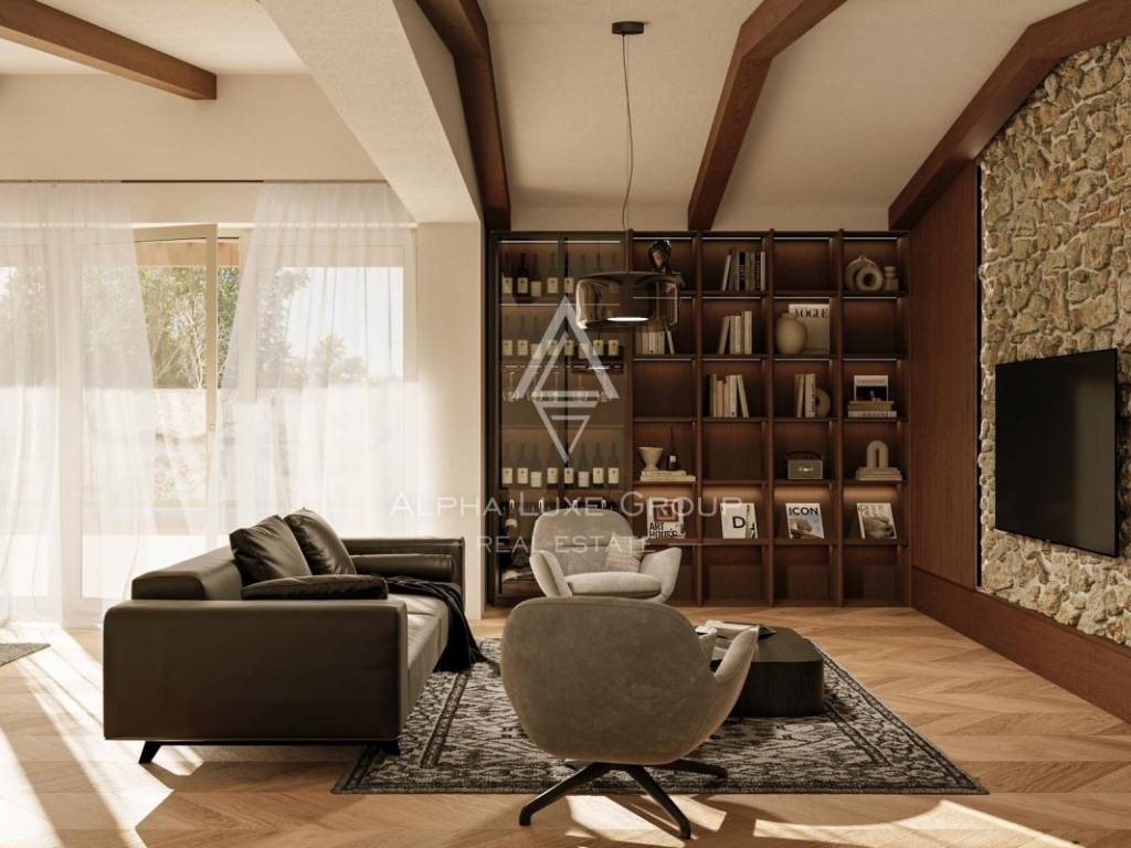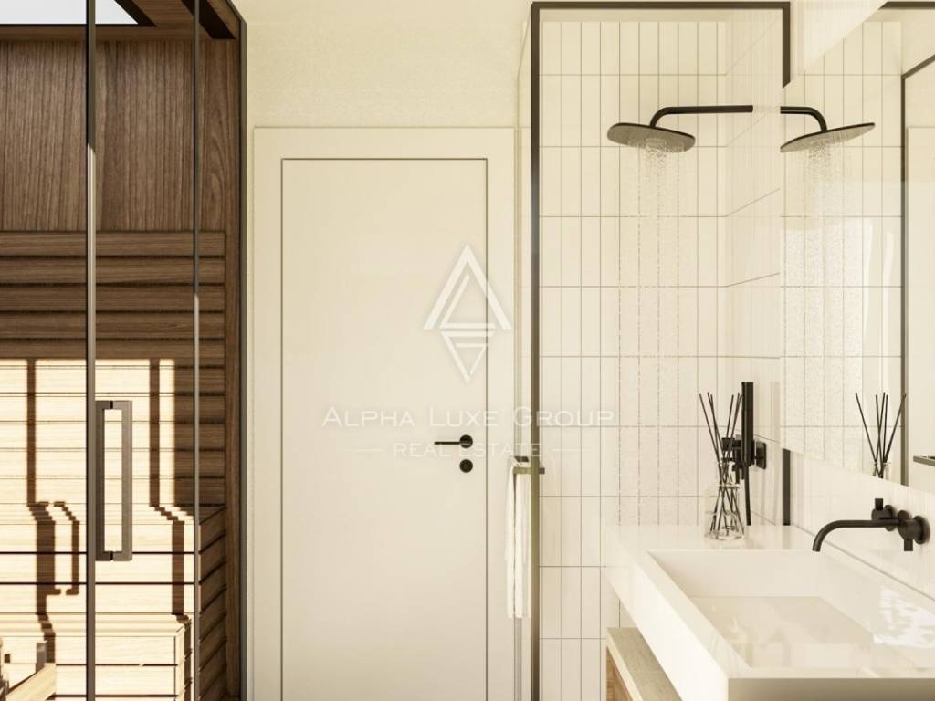 Prizemlje vile obuhvaća otvoreni koncept kuhinje, blagovaonice i prostranog dnevnog boravka s visokim stropovima i vidljivim drvenim gredama, stvarajući svijetao i prozračan prostor. Privatna sauna s pogledom na vanjski bazen dodatno doprinosi wellness ugođaju i opuštanju.