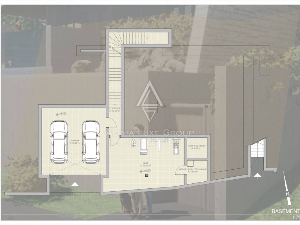 Raspored vile dizajniran je kako bi maksimizirao luksuz i prostor. Podrum uključuje privatno parkirno mjesto za dva vozila. U prizemlju se nalazi prostrani dnevni boravak otvorenog koncepta, blagovaonica i kuhinja, koji se savršeno povezuju s velikom terasom i bazenom s preljevom, pružajući spektakularan pogled. Na prvom katu nalaze se prostrane spavaće sobe, svaka s vlastitom garderobom, uključujući impresivnu glavnu spavaću sobu koja dodatno naglašava udobnost i stil.