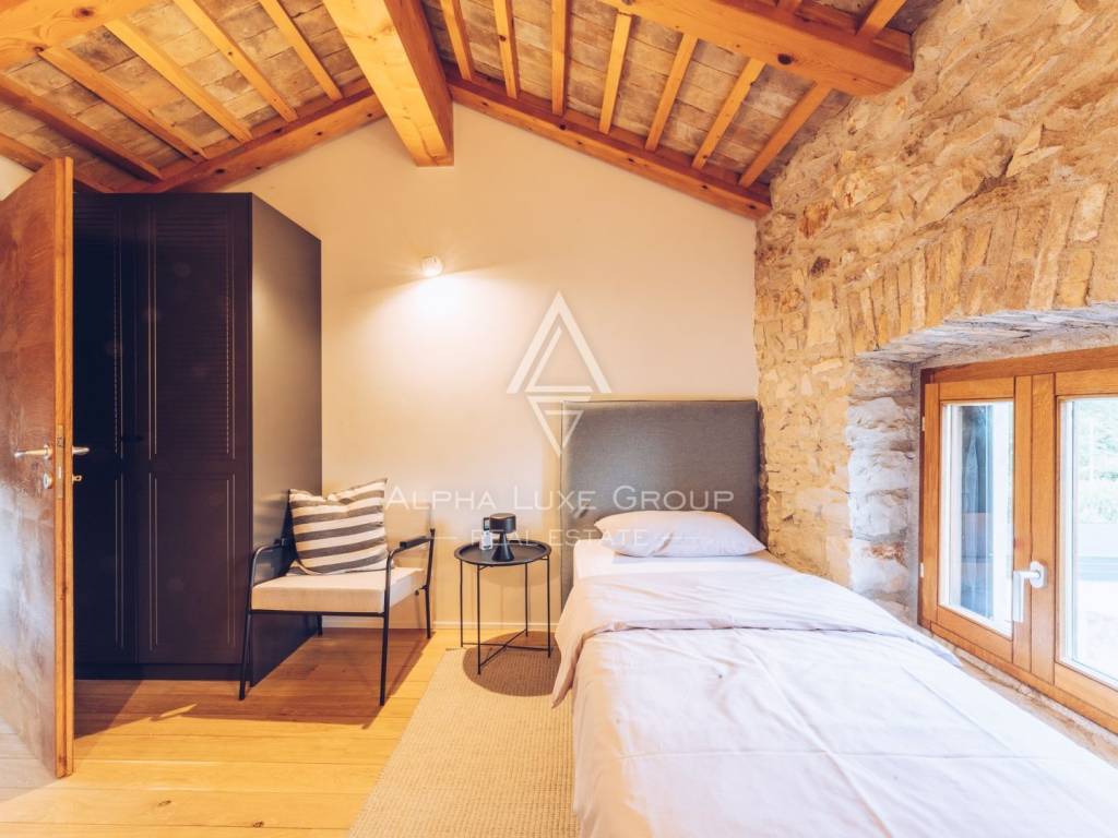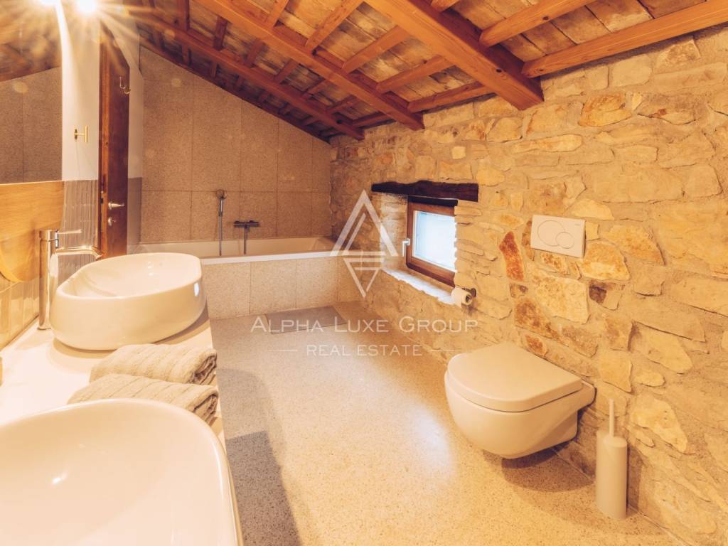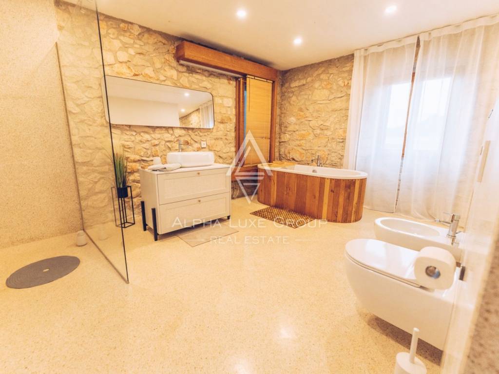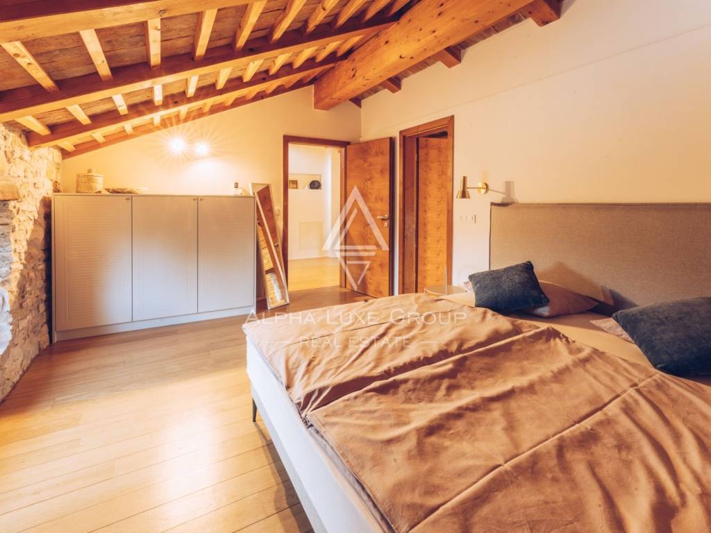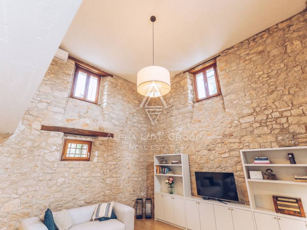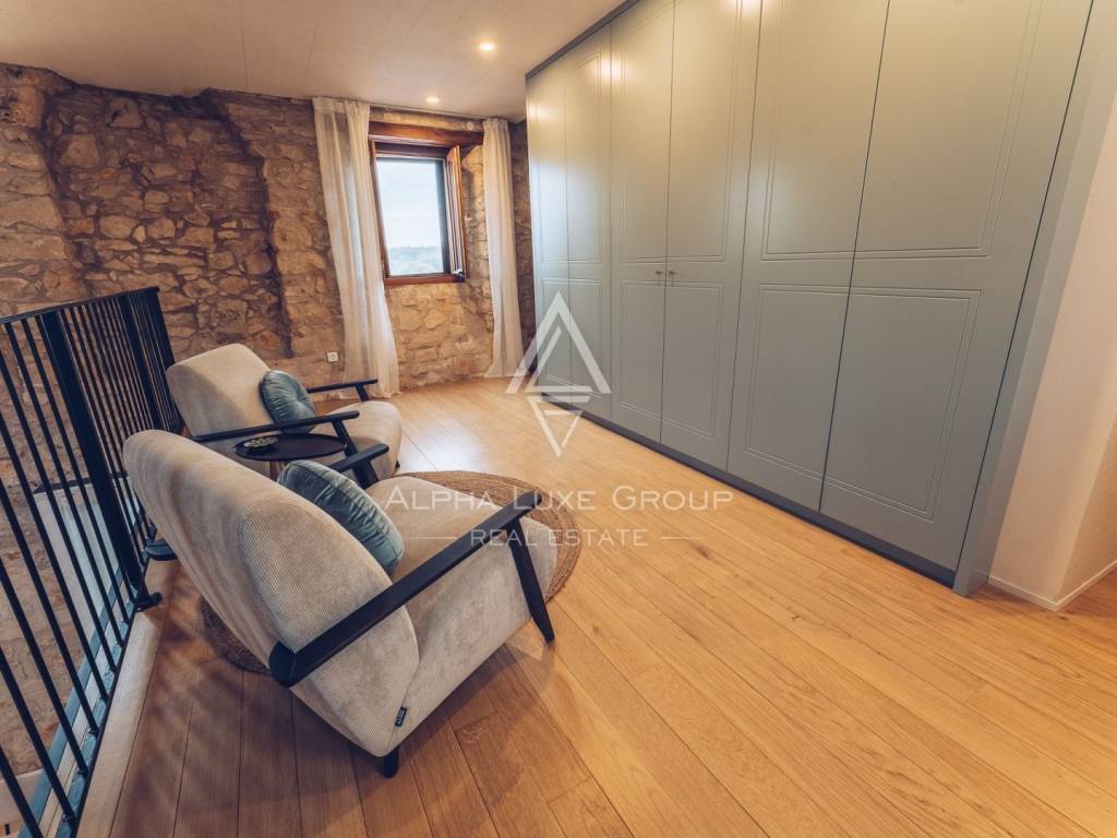 Na prvom katu nalazi se glavna spavaća soba s vlastitom kupaonicom i pogledom na zelenilo, bazen i more. U visokom potkrovlju nalaze se još tri spavaće sobe i dvije kupaonice, što ovu vilu čini idealnom za obitelji ili goste. Vila je renovirana zadržavajući originalne kamene i drvene detalje, a moderni dodaci uključuju podno grijanje u cijelom objektu.