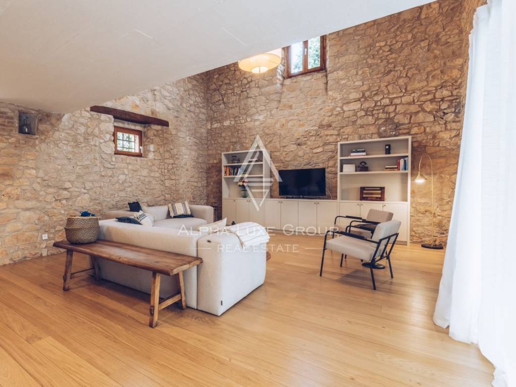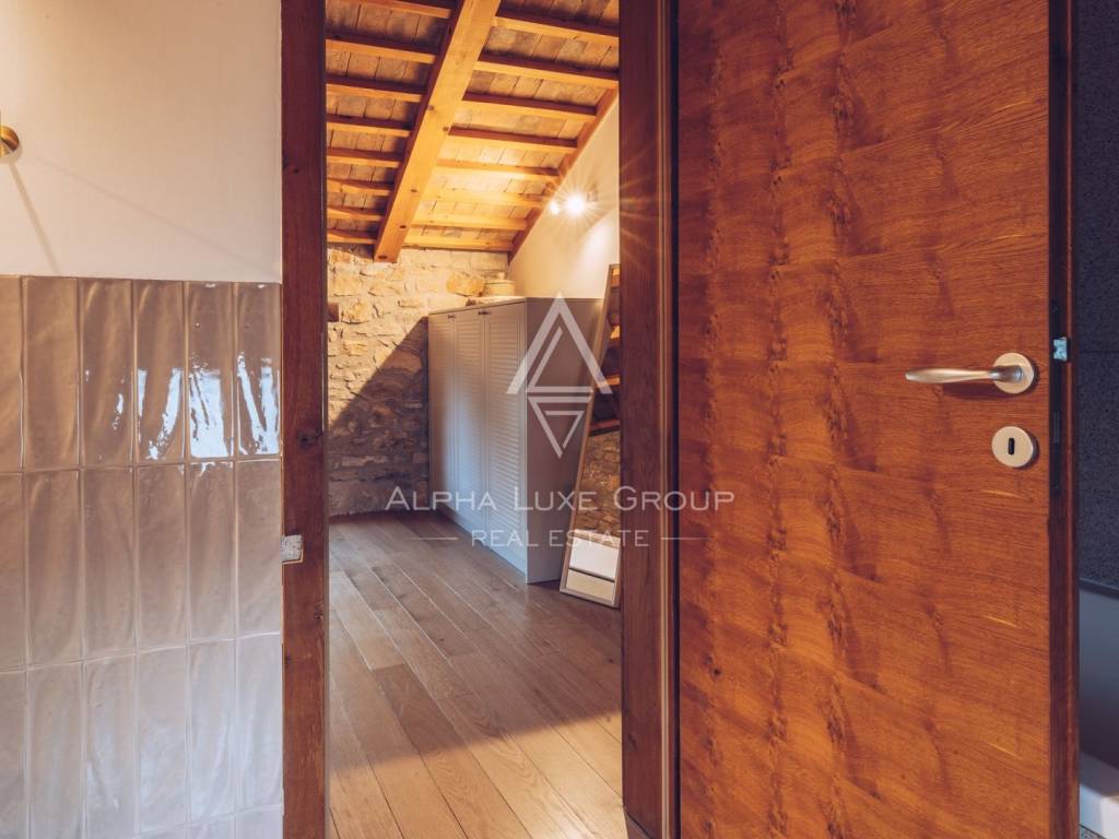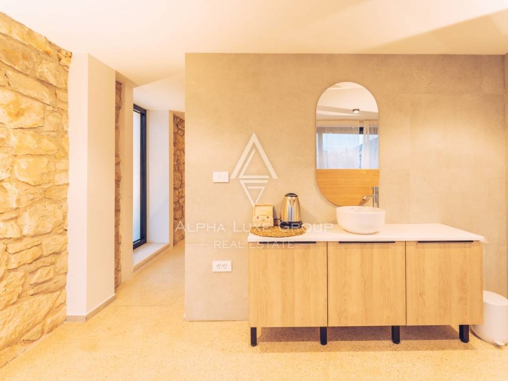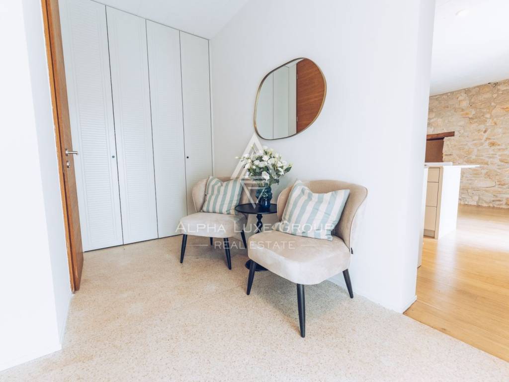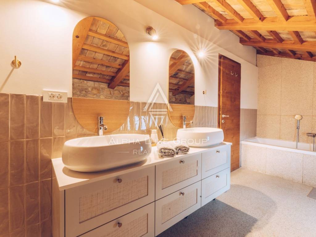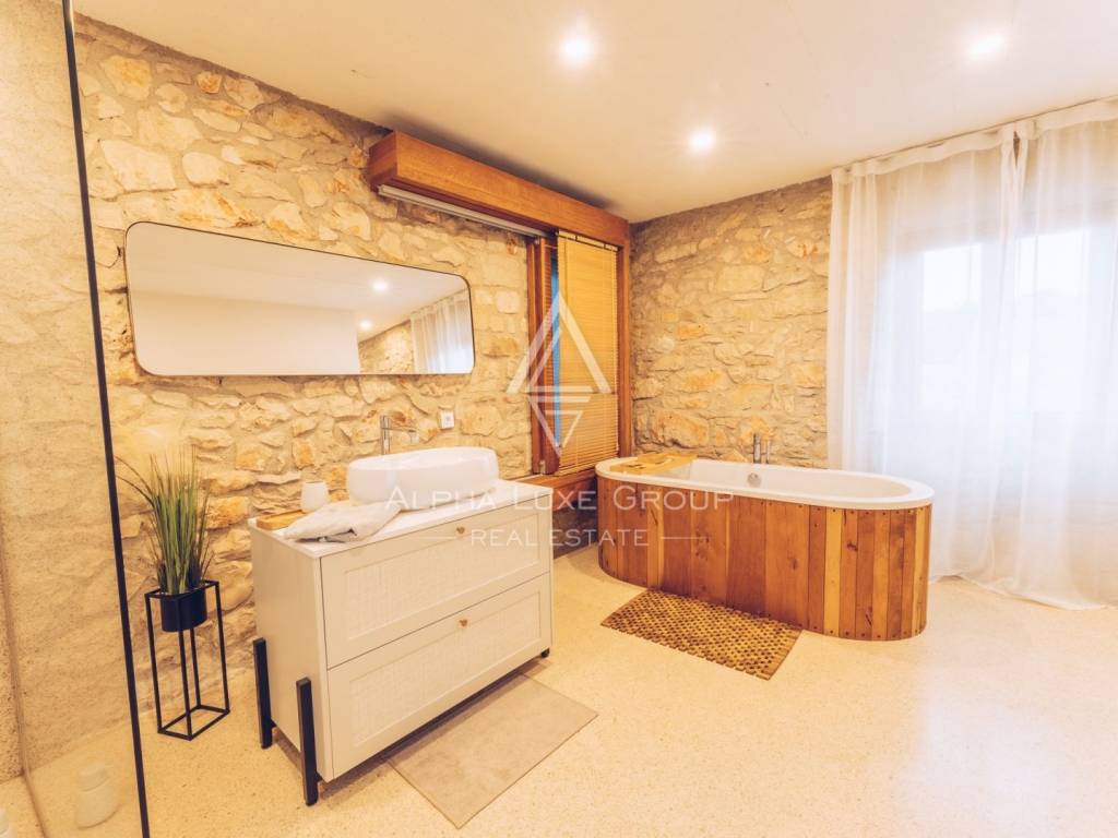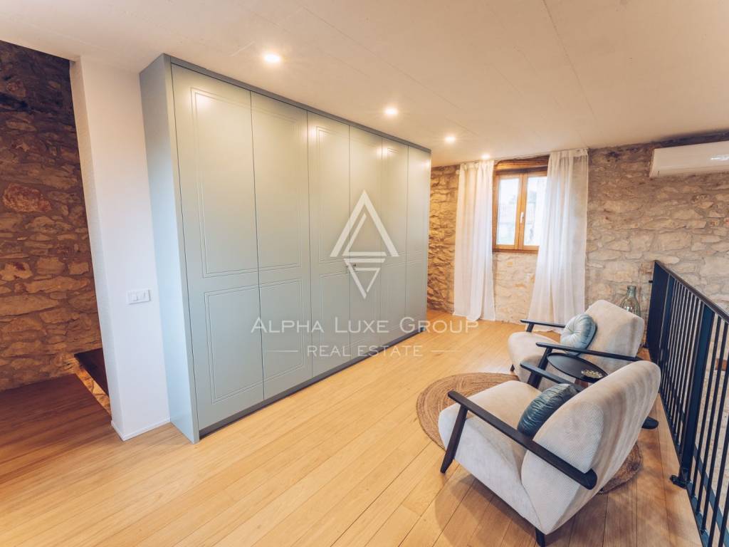 Na prvom katu nalazi se glavna spavaća soba s vlastitom kupaonicom i pogledom na zelenilo, bazen i more. U visokom potkrovlju nalaze se još tri spavaće sobe i dvije kupaonice, što ovu vilu čini idealnom za obitelji ili goste. Vila je renovirana zadržavajući originalne kamene i drvene detalje, a moderni dodaci uključuju podno grijanje u cijelom objektu.
