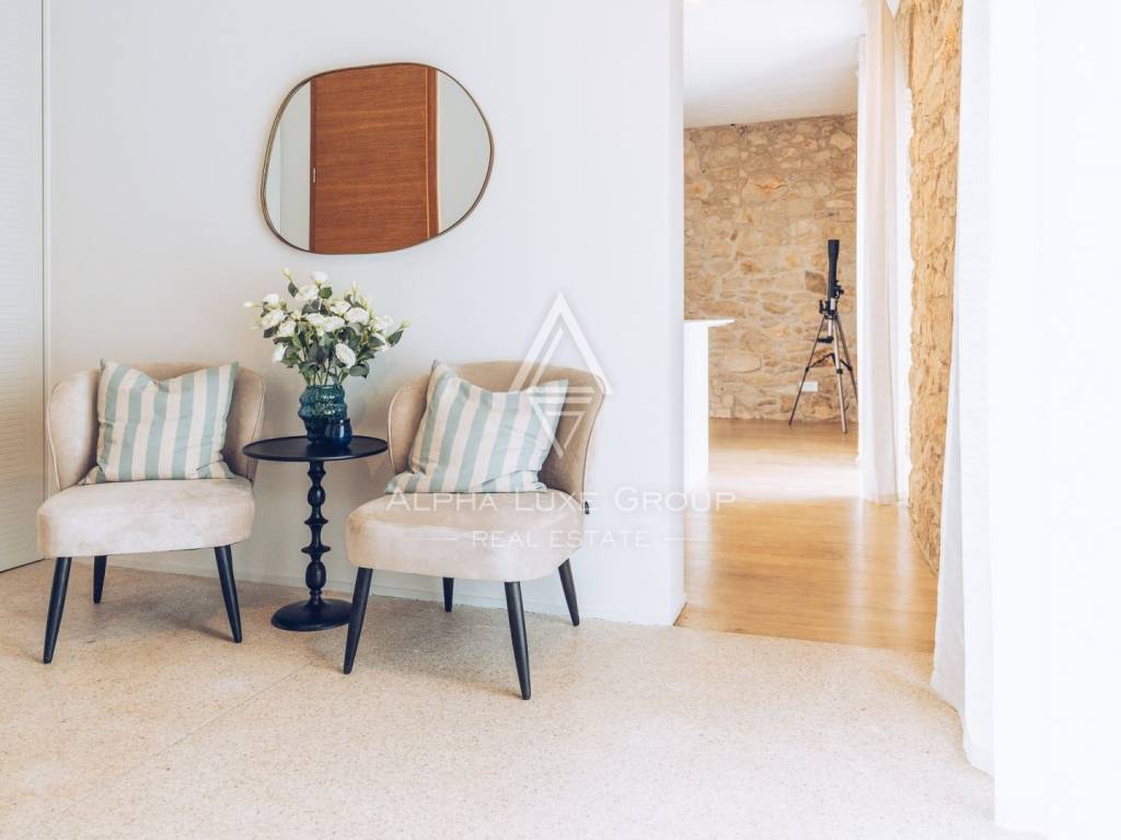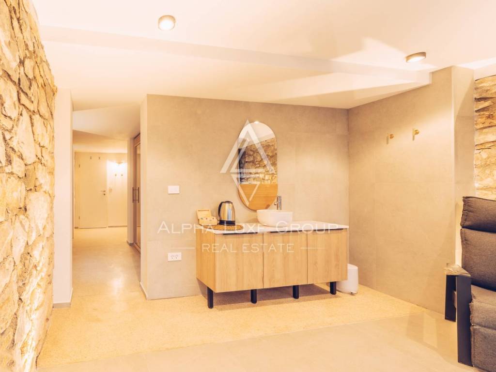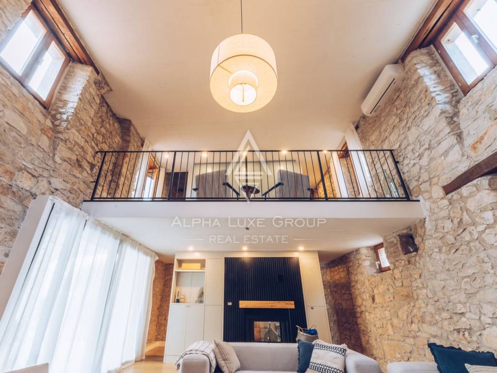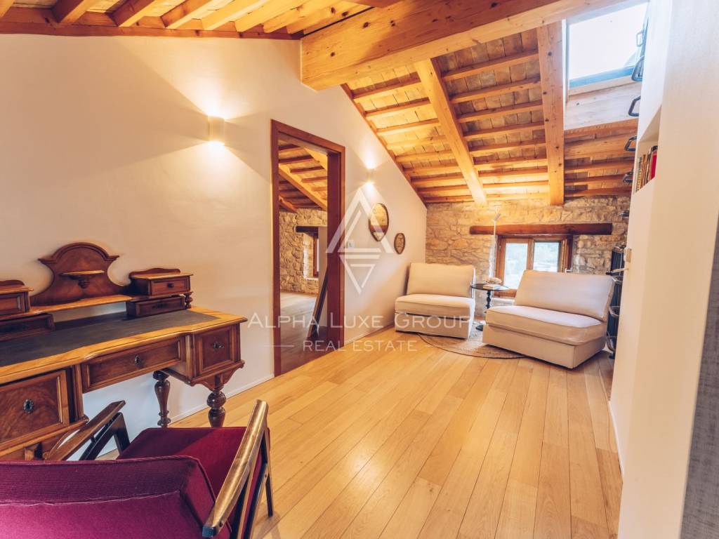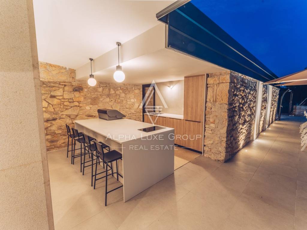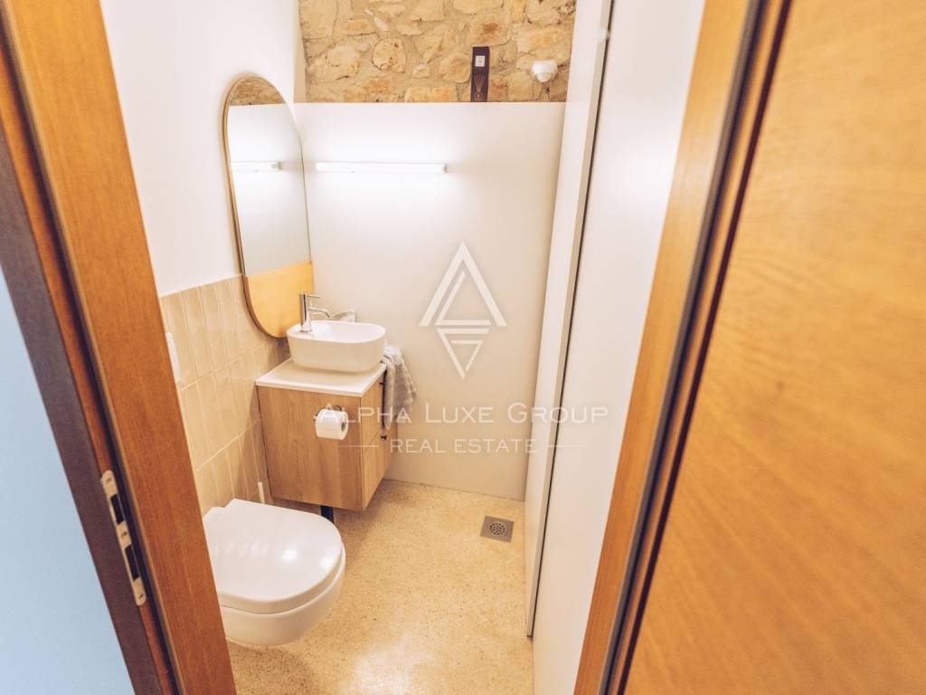 Na prvom katu nalazi se glavna spavaća soba s vlastitom kupaonicom i pogledom na zelenilo, bazen i more. U visokom potkrovlju nalaze se još tri spavaće sobe i dvije kupaonice, što ovu vilu čini idealnom za obitelji ili goste. Vila je renovirana zadržavajući originalne kamene i drvene detalje, a moderni dodaci uključuju podno grijanje u cijelom objektu.