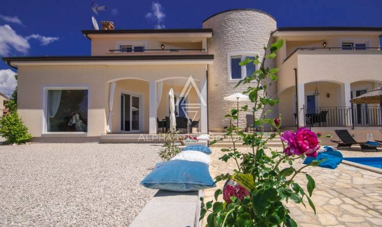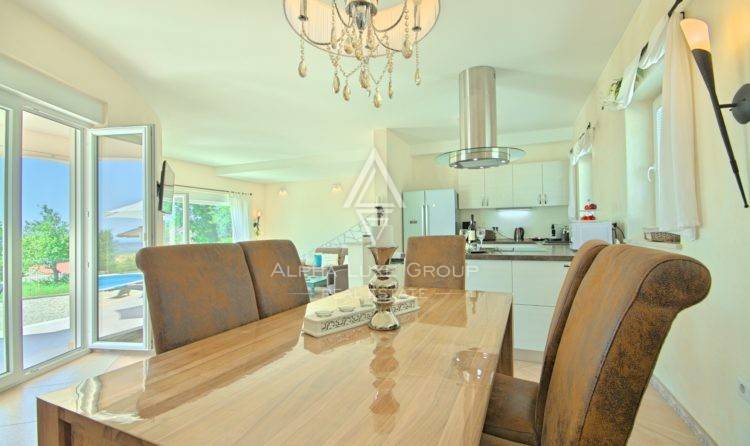 Vanjski prostor jednako je impresivan — uređeni mediteranski vrt, bazen s prostorom za sunčanje, natkrivene lounge zone za opuštanje i druženje, te očaravajući panoramski pogled na more koji upotpunjuje luksuzan i opuštajući ugođaj.