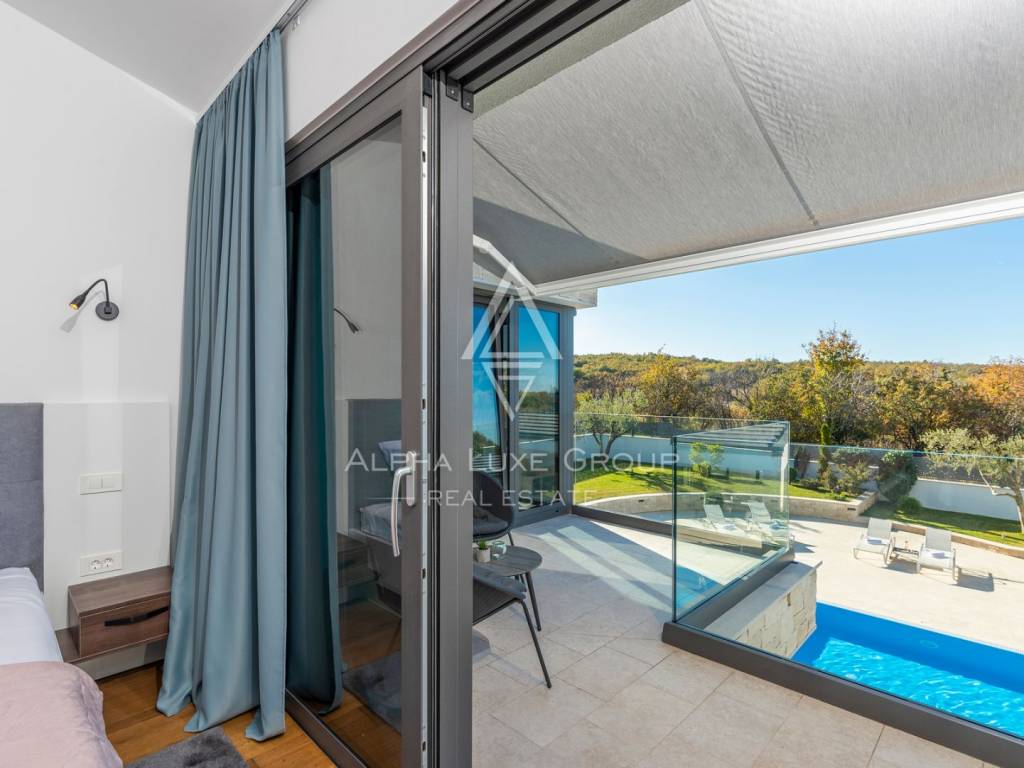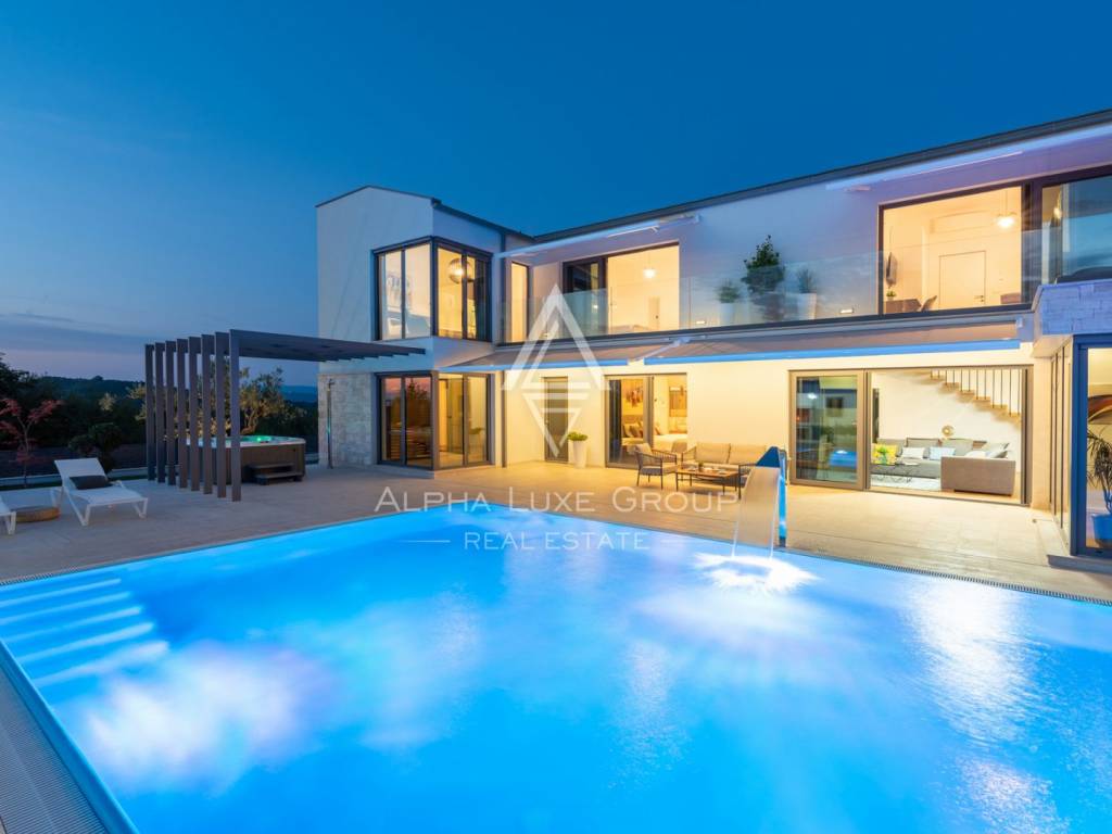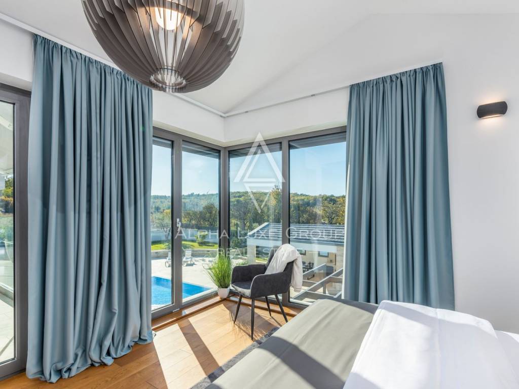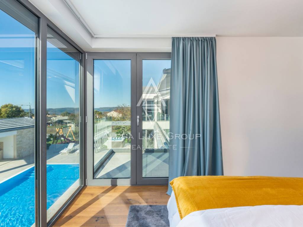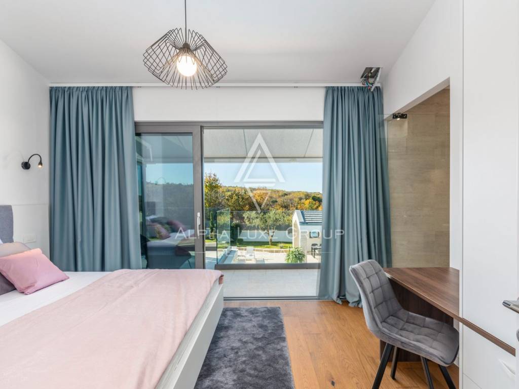 Prizemlje obuhvaća elegantan ulazni hodnik s garderobom, gostinjski toalet, spavaću sobu s vlastitom kupaonicom te prostrani open-space dnevni boravak koji povezuje modernu kuhinju, blagovaonicu i lounge zonu. Velike staklene stijene omogućuju neprekinut prijelaz između interijera i eksterijera te pružaju pogled na bazen, terasu i zelenilo. Na katu se nalaze četiri komforne spavaće sobe, svaka s vlastitom kupaonicom i balkonom, te dodatna garderoba ili praonica i visokokvalitetna sanitarna oprema.
