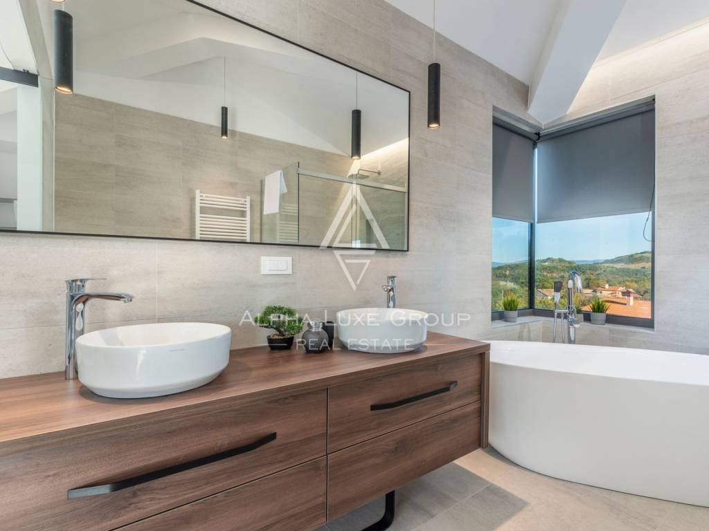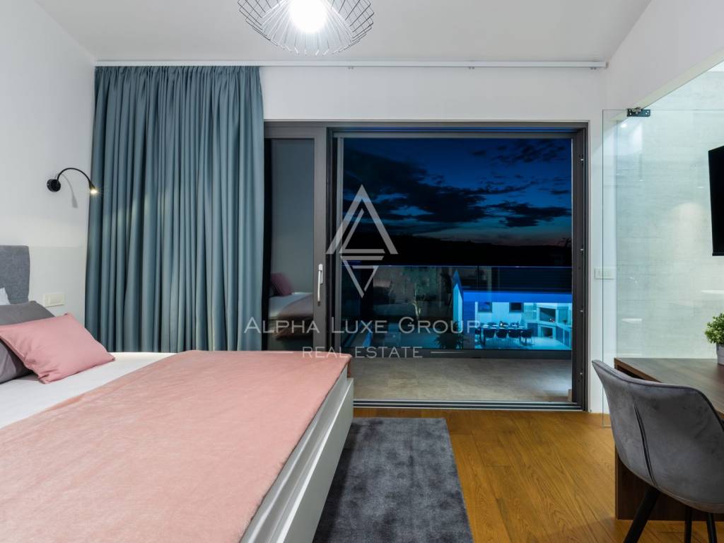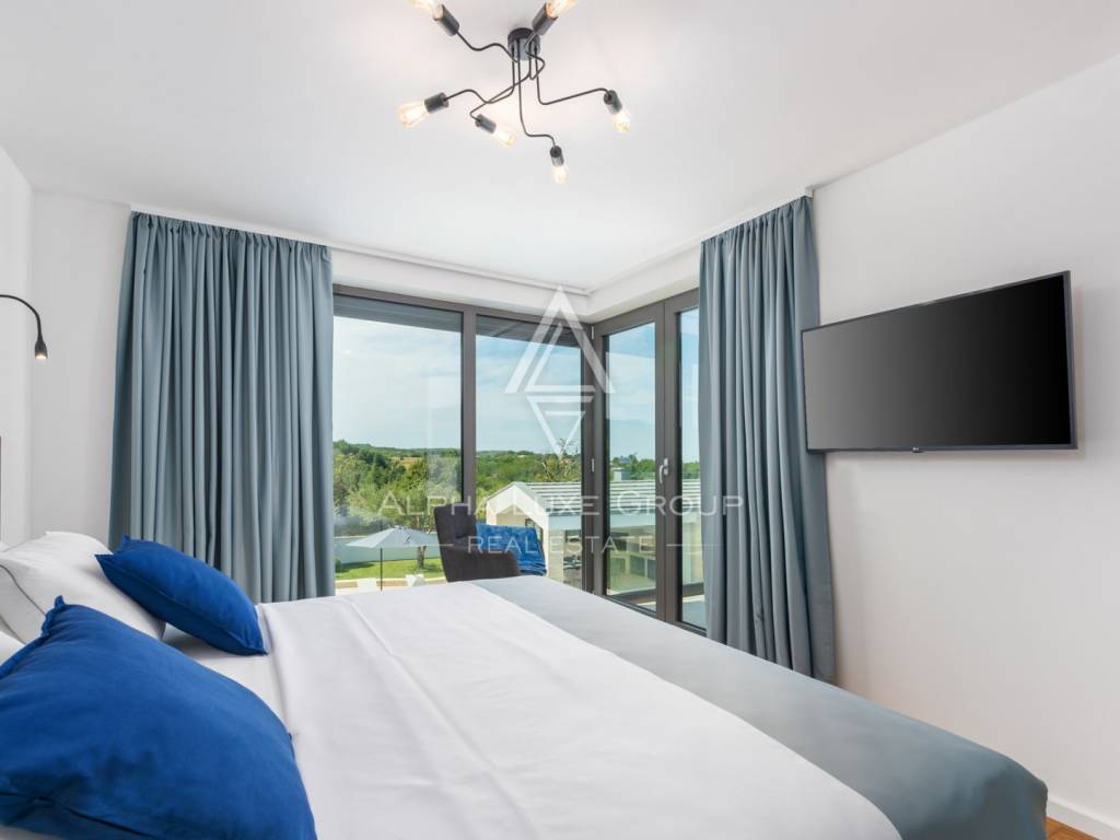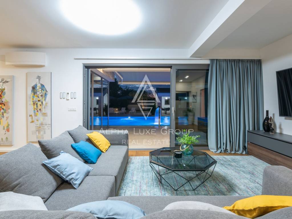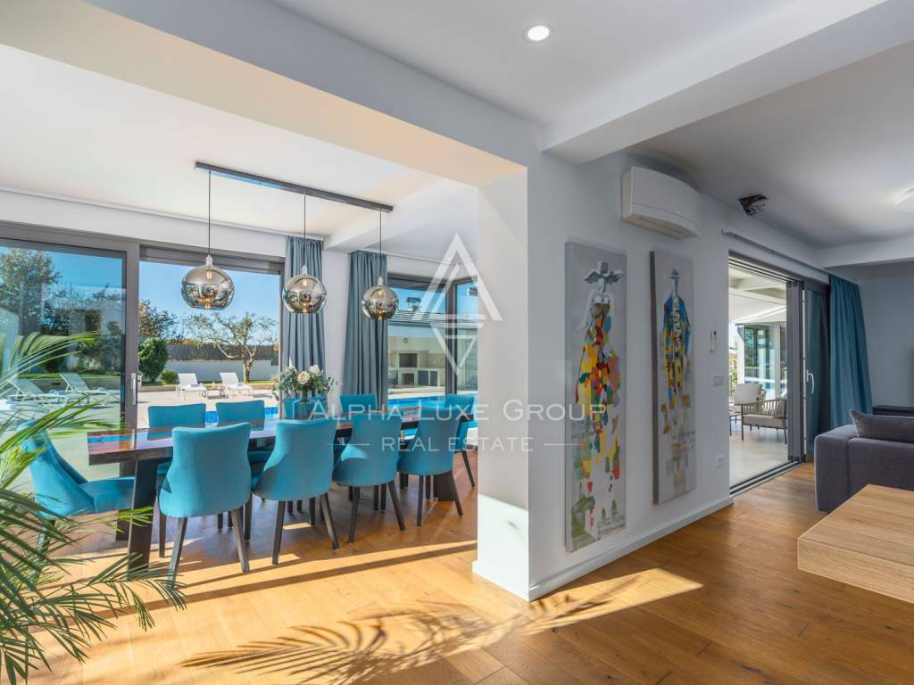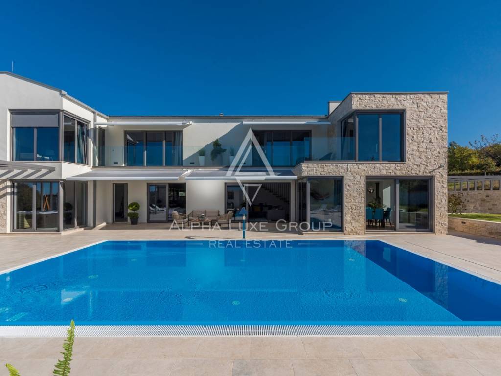 Prizemlje obuhvaća elegantan ulazni hodnik s garderobom, gostinjski toalet, spavaću sobu s vlastitom kupaonicom te prostrani open-space dnevni boravak koji povezuje modernu kuhinju, blagovaonicu i lounge zonu. Velike staklene stijene omogućuju neprekinut prijelaz između interijera i eksterijera te pružaju pogled na bazen, terasu i zelenilo. Na katu se nalaze četiri komforne spavaće sobe, svaka s vlastitom kupaonicom i balkonom, te dodatna garderoba ili praonica i visokokvalitetna sanitarna oprema.