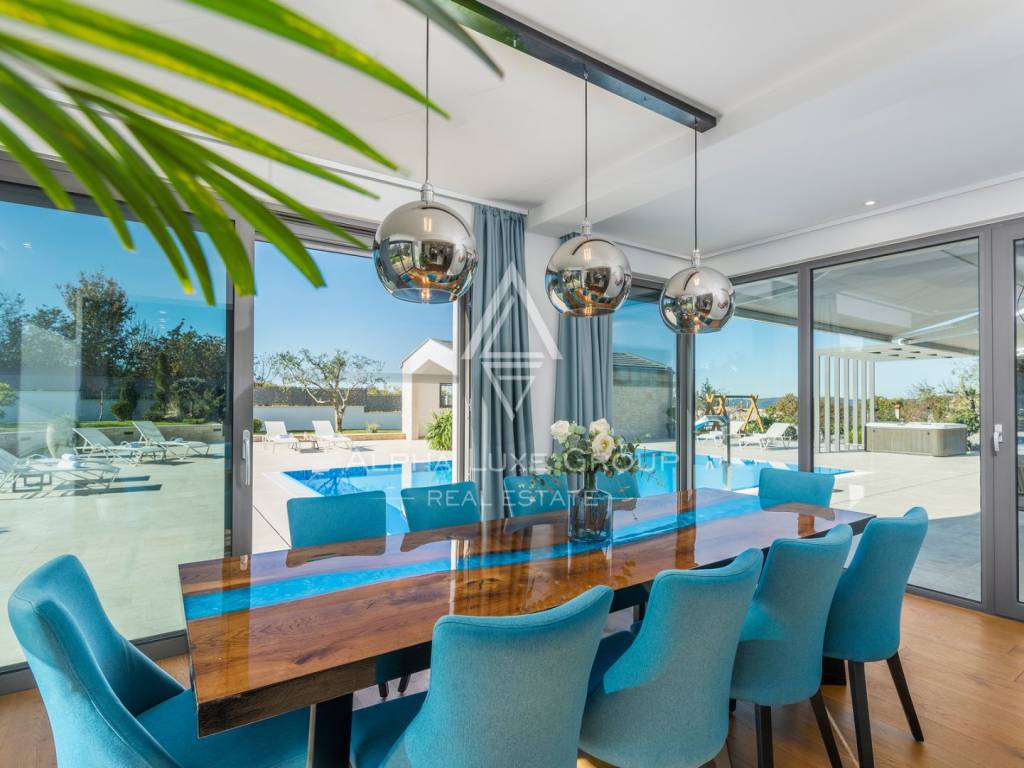 U vanjskom dijelu nalazi se infinity bazen od 60 m² s automatskim sustavom čišćenja, kontrolom kvalitete vode i podvodnim masažama, natkriveni jacuzzi, ljetna kuhinja s ugrađenim roštiljem, dječje igralište sa sigurnosnom podlogom, zatvoreno spremište 4×4 m te četiri natkrivena parkirna mjesta. Svaka vanjska zona osmišljena je kako bi pružila maksimalnu udobnost, obilje sunca i potpunu privatnost.
