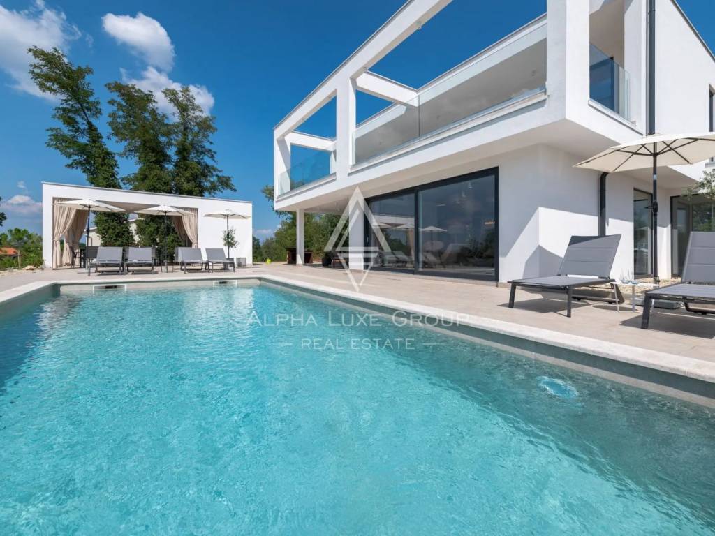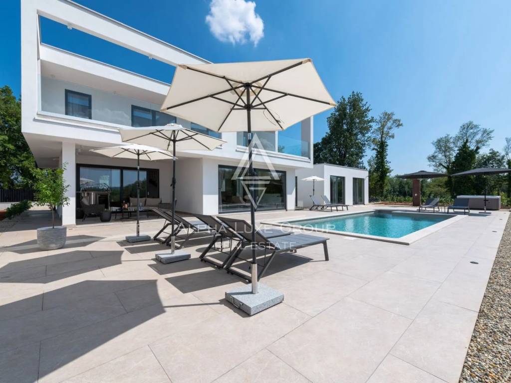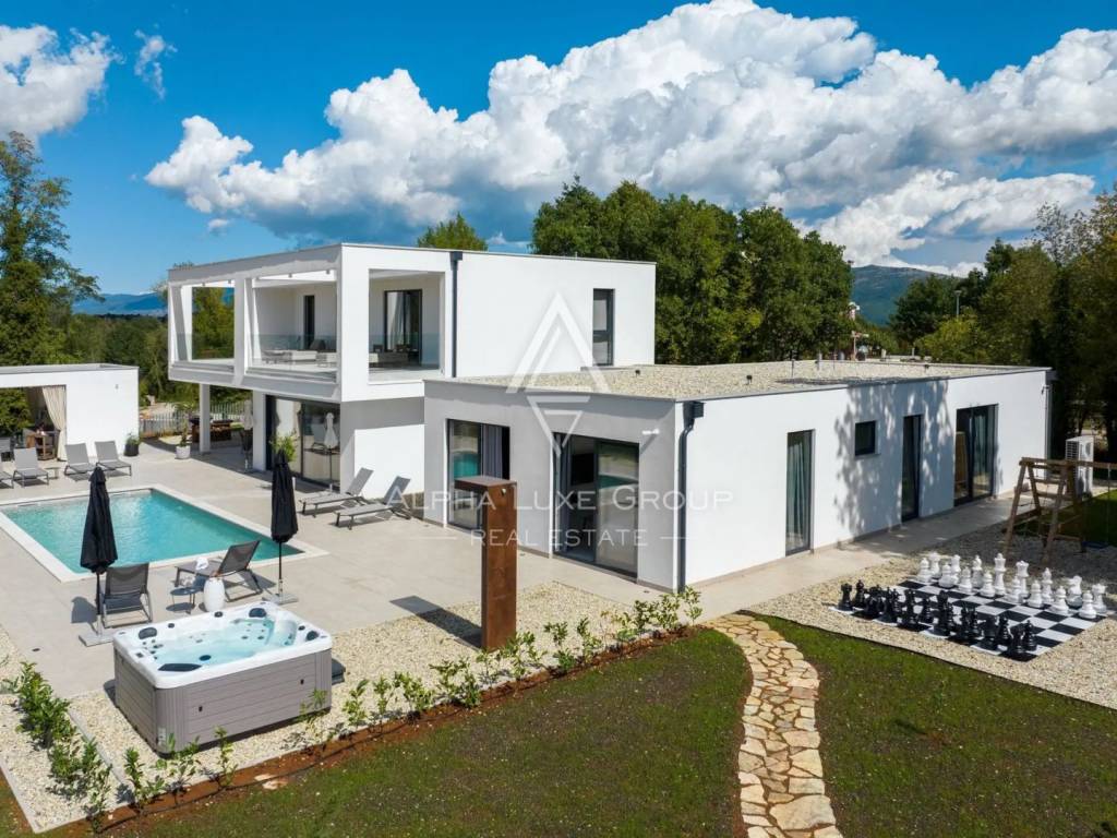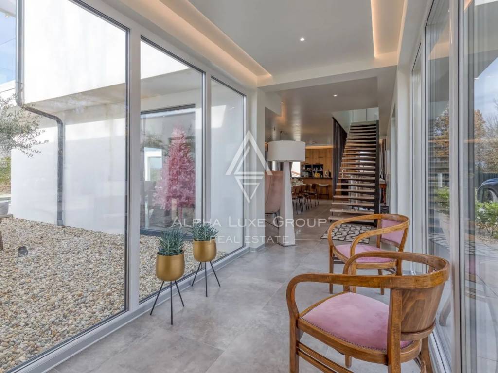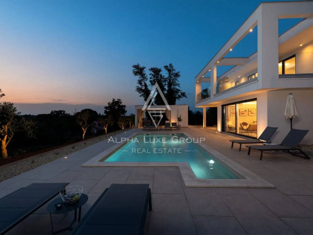 Iskusite elegantnu luksuznu vilu na prodaju u Labinu, smještenu na mirnom rubnom dijelu istočne Istre, okruženu bujnom zelenilom, vinogradima i mediteranskim pejzažima. Dizajnirana za cjelogodišnji boravak, ova vrhunski opremljena kuća nudi premium sadržaje, prostrane interijere i profinjen spoj modernog života i prirodnog mira.