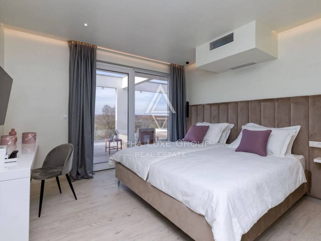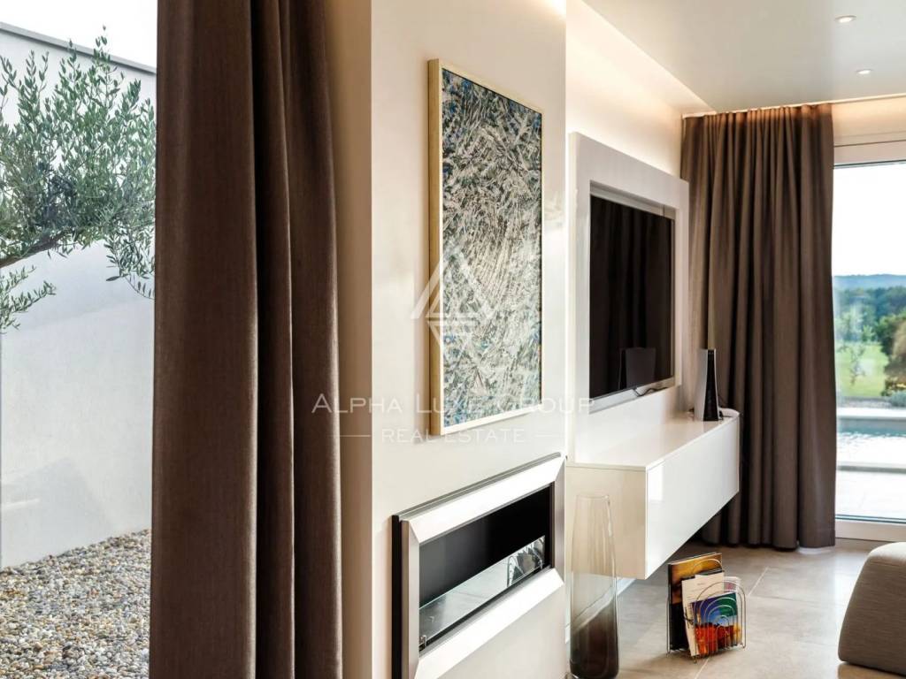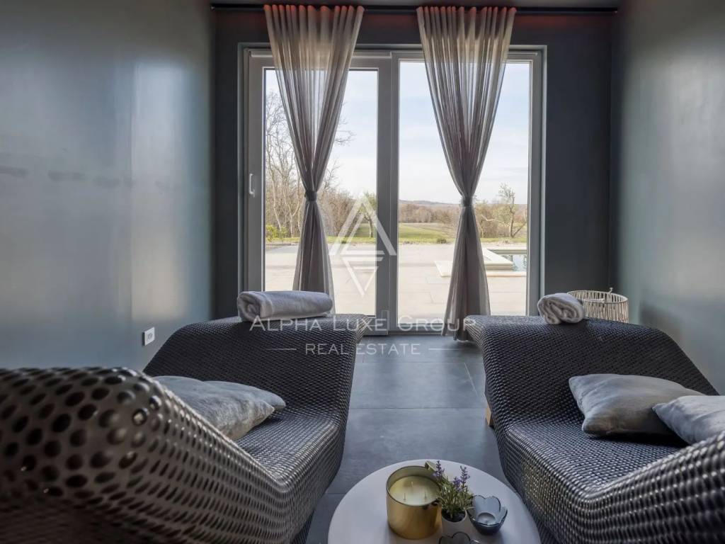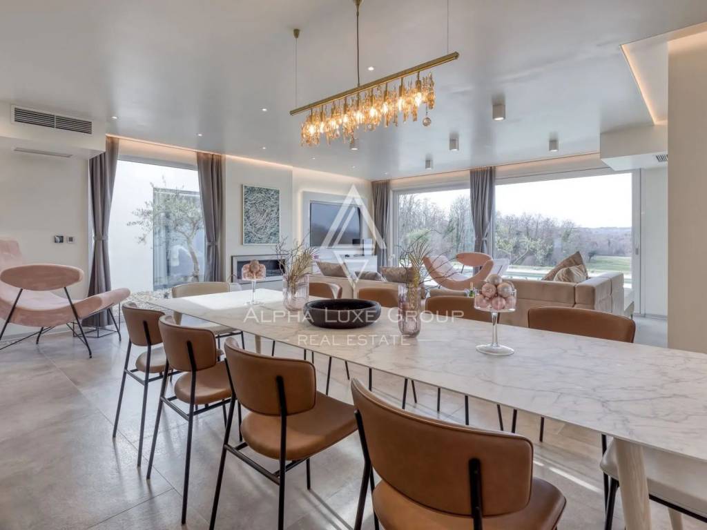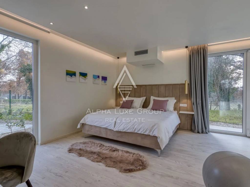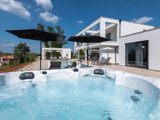Iskusite elegantnu luksuznu vilu na prodaju u Labinu, smještenu na mirnom rubnom dijelu istočne Istre, okruženu bujnom zelenilom, vinogradima i mediteranskim pejzažima. Dizajnirana za cjelogodišnji boravak, ova vrhunski opremljena kuća nudi premium sadržaje, prostrane interijere i profinjen spoj modernog života i prirodnog mira.