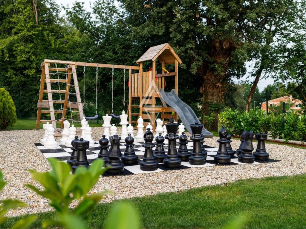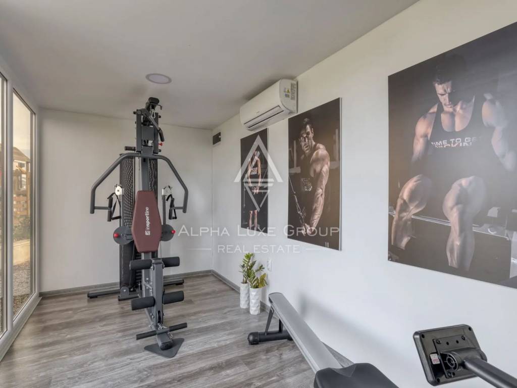 Eksterijer je osmišljen za potpuni odmor: grijani bazen, sunčalište s osam ležaljki, jacuzzi za pet osoba, vanjski tuš i bogato uređeni mediteranski vrt. Natkrivena ljetna kuhinja s roštiljem i blagovaonicom idealna je za okupljanja, dok lounge terasa pruža miran ambijent za uživanje u zalasku sunca. Za aktivne trenutke tu su privatna teretana i vrtni jumbo-šah.