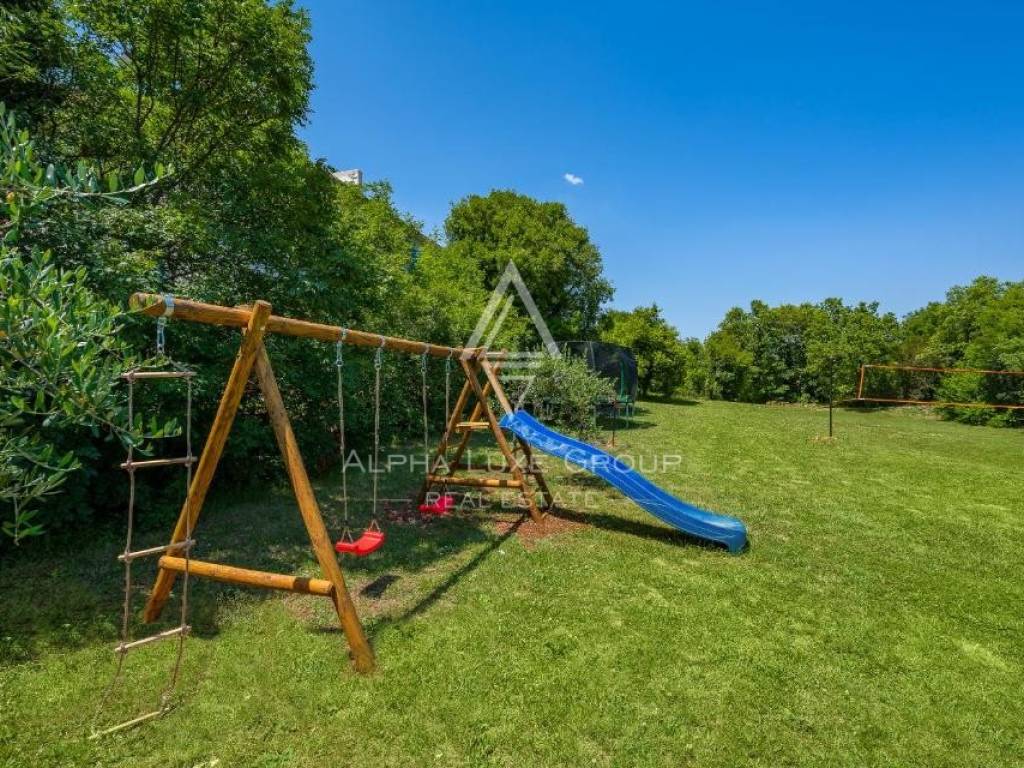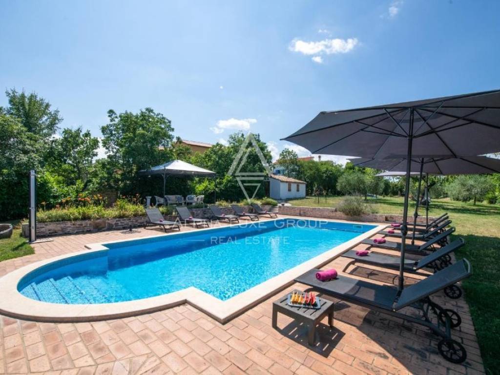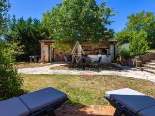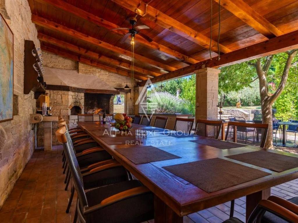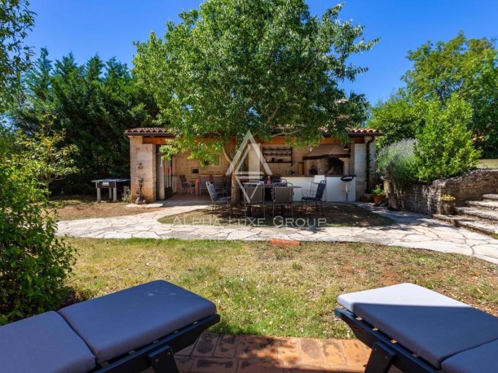 U prekrasno uređenom dvorištu nalazi se privlačan bazen okružen sunčalištem, mediteranskim zelenilom i obiljem prostora za uživanje. Natkrivena ljetna kuhinja s kamenim kaminom nudi idealan prostor za druženja, pripremu hrane na otvorenom i uživanje u poznatoj istarskoj gastronomiji. Dvije dodatne vanjske sobe s privatnim kupaonicama proširuju kapacitete za goste ili turistički najam.