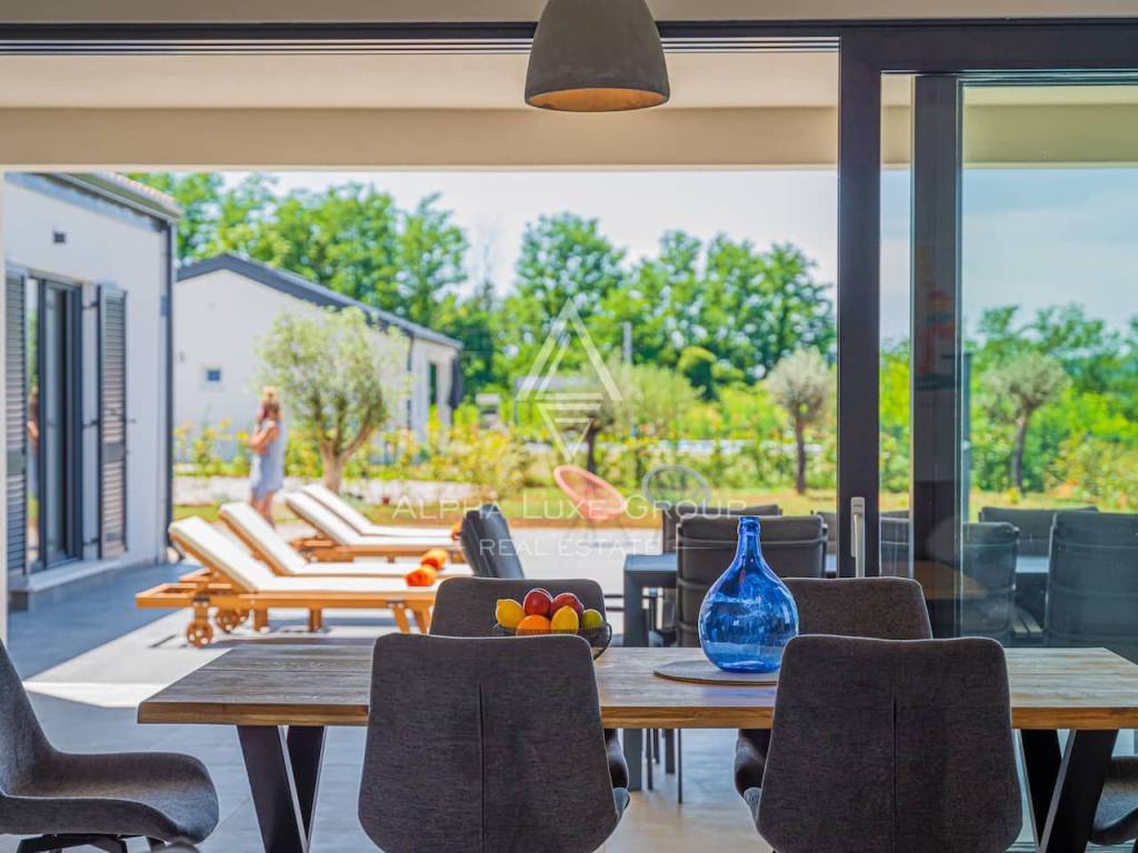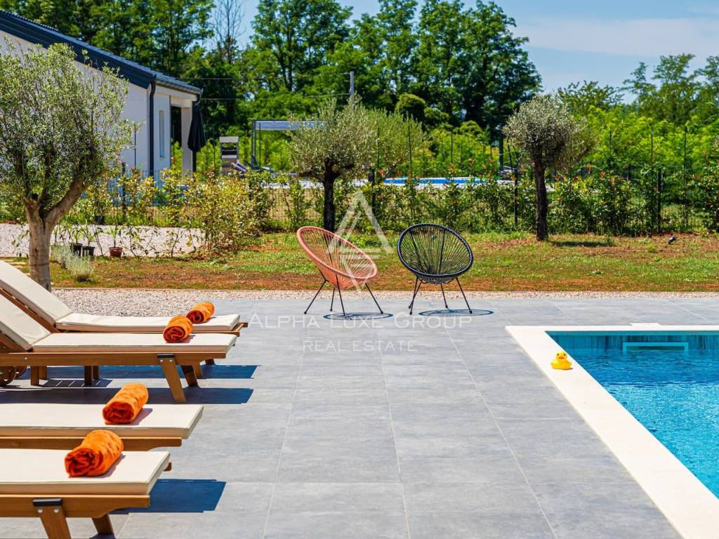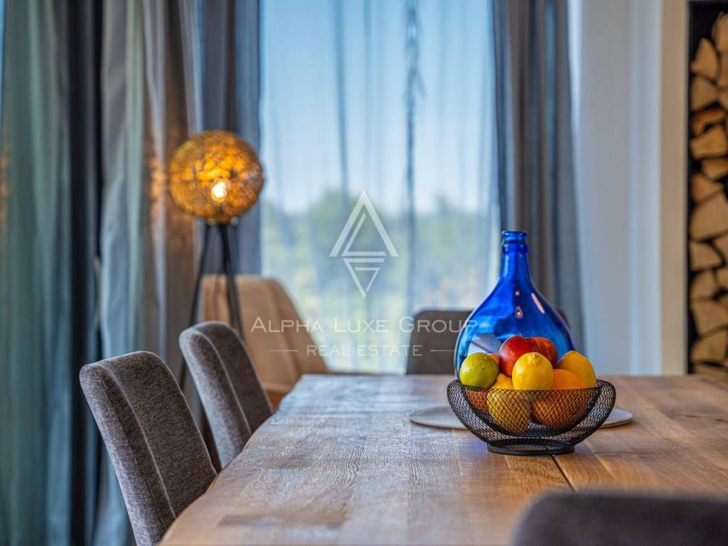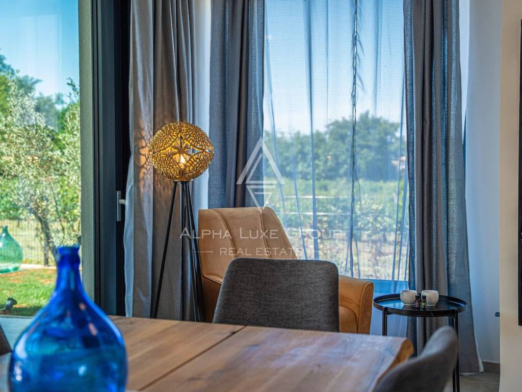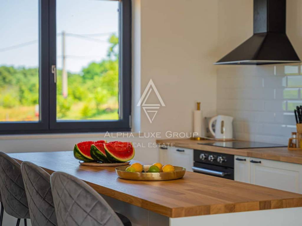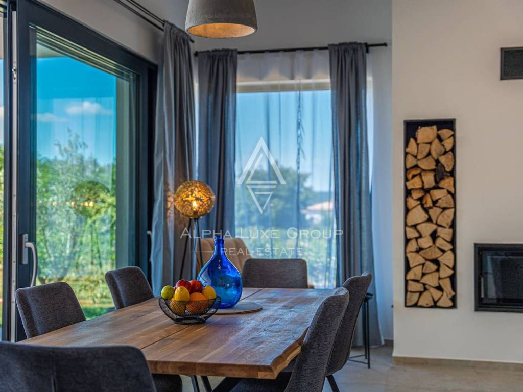 Smještena u mirnom naselju u blizini Labina, ova prekrasno dizajnirana kuća nudi profinjenu udobnost okruženu prirodnim krajolikom i tradicionalnim istarskim šarmom. Nekretnina predstavlja skladan spoj kvalitetne gradnje, ukusno uređenog interijera i rasporeda stvorenog za opuštanje i suvremeni stil života. Svijetli otvoreni dnevni prostor povezuje kuhinju, blagovaonicu i dnevni boravak te vodi na natkrivenu terasu s pogledom na vrt i bazen. Tri pažljivo uređene spavaće sobe svaka imaju vlastitu kupaonicu, dok gostinjski toalet i tehničke prostorije dodatno olakšavaju svakodnevni boravak.