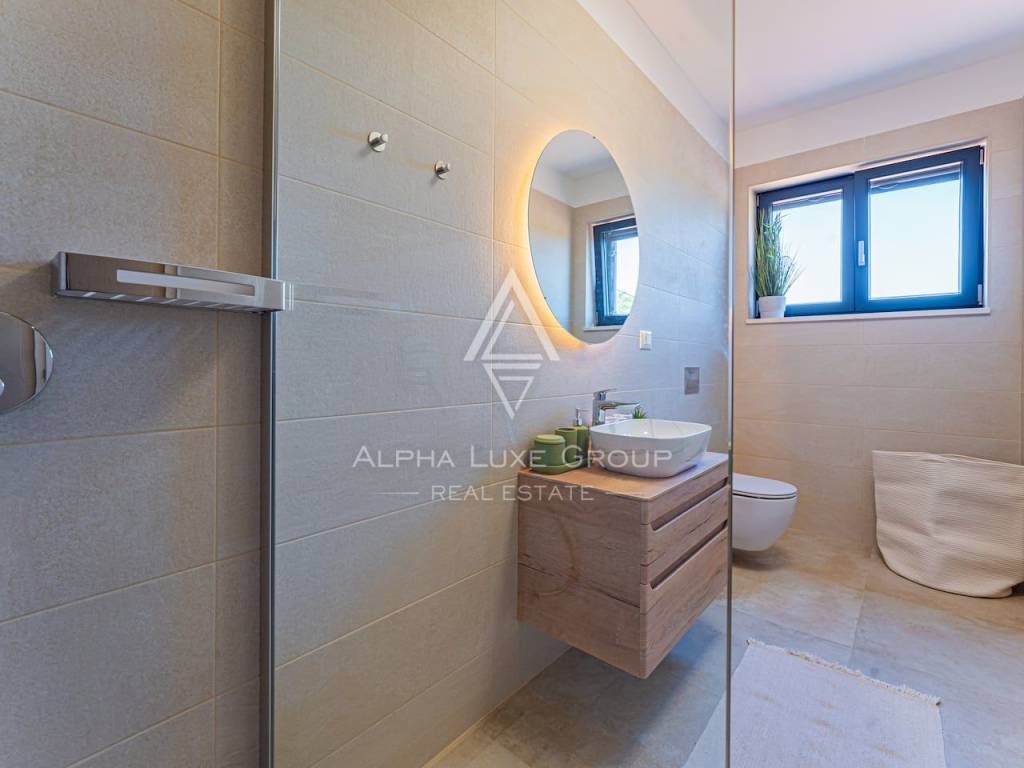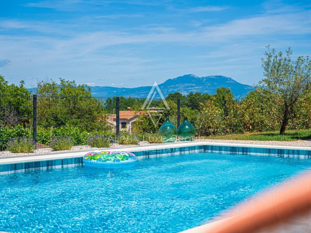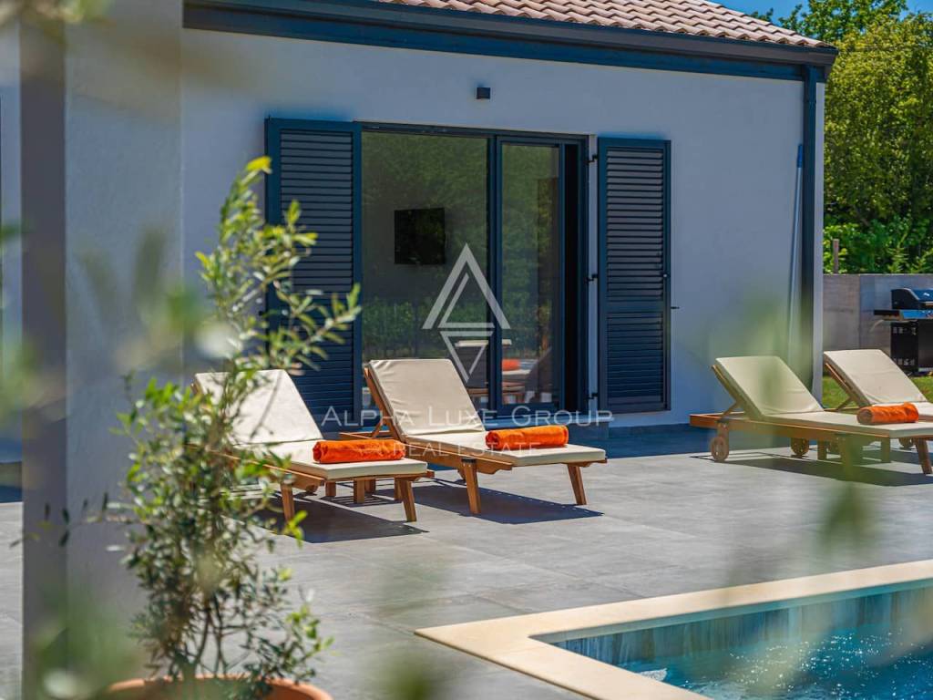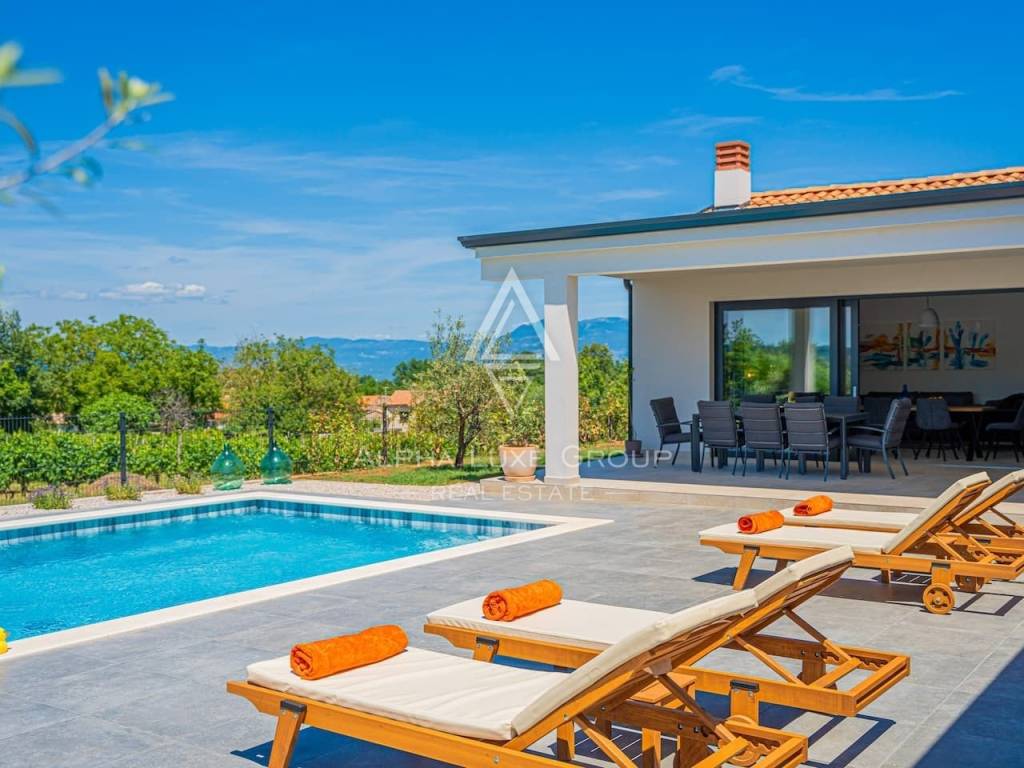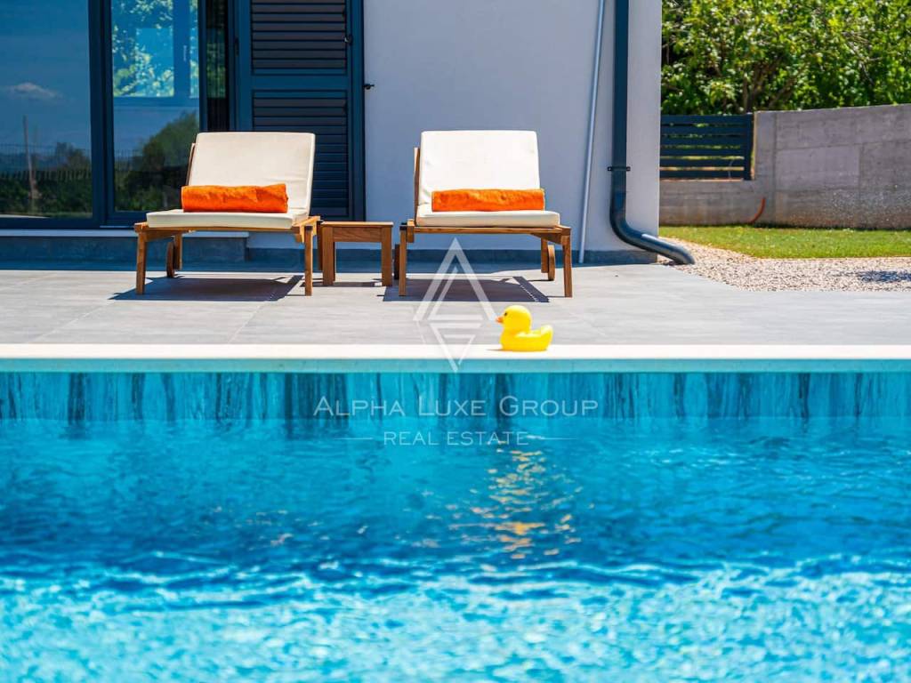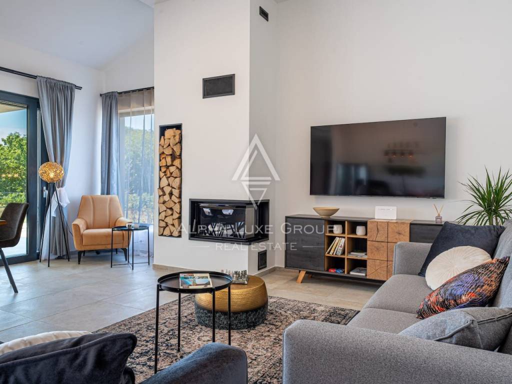 Smještena u mirnom naselju u blizini Labina, ova prekrasno dizajnirana kuća nudi profinjenu udobnost okruženu prirodnim krajolikom i tradicionalnim istarskim šarmom. Nekretnina predstavlja skladan spoj kvalitetne gradnje, ukusno uređenog interijera i rasporeda stvorenog za opuštanje i suvremeni stil života. Svijetli otvoreni dnevni prostor povezuje kuhinju, blagovaonicu i dnevni boravak te vodi na natkrivenu terasu s pogledom na vrt i bazen. Tri pažljivo uređene spavaće sobe svaka imaju vlastitu kupaonicu, dok gostinjski toalet i tehničke prostorije dodatno olakšavaju svakodnevni boravak.