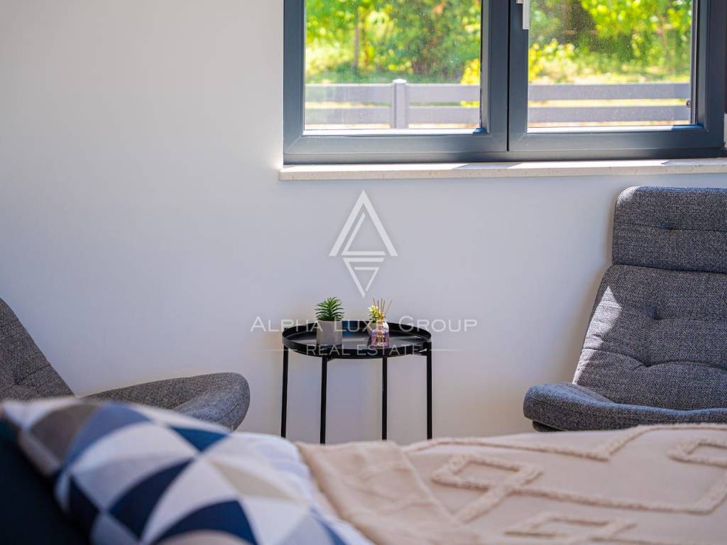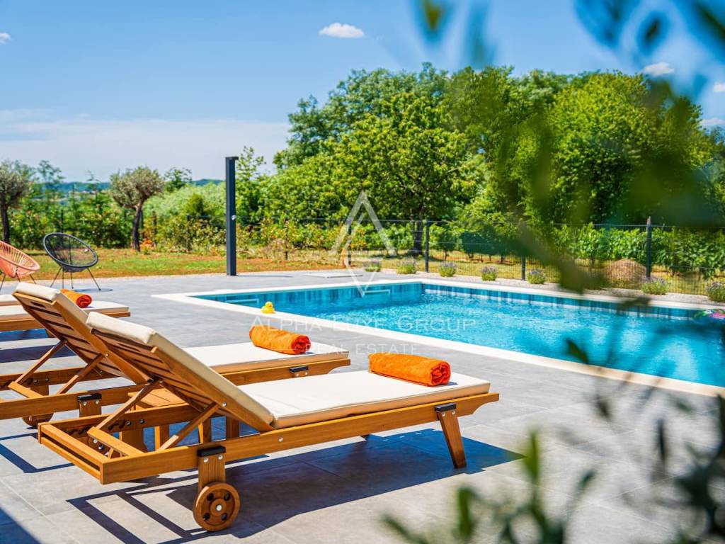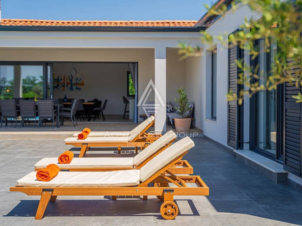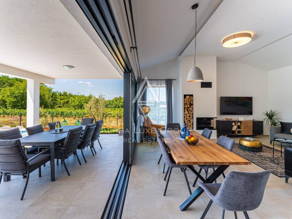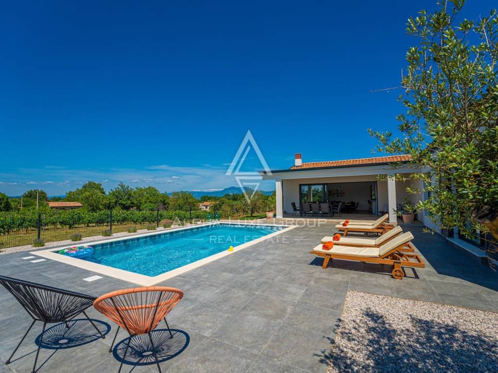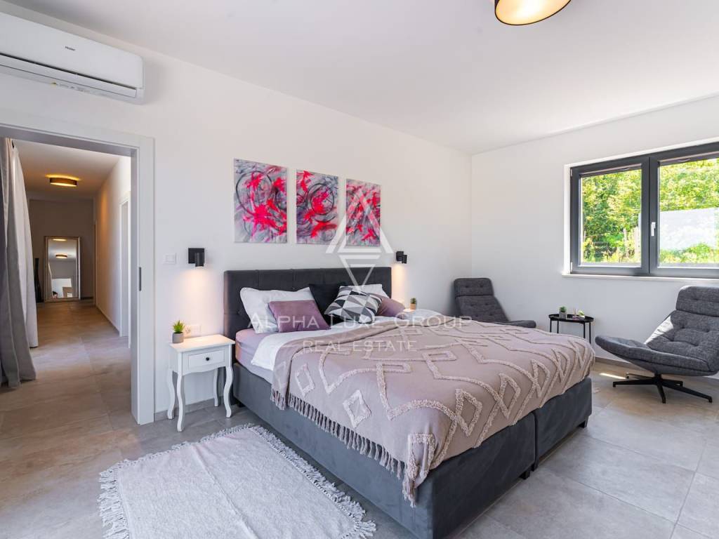 Smještena u mirnom naselju u blizini Labina, ova prekrasno dizajnirana kuća nudi profinjenu udobnost okruženu prirodnim krajolikom i tradicionalnim istarskim šarmom. Nekretnina predstavlja skladan spoj kvalitetne gradnje, ukusno uređenog interijera i rasporeda stvorenog za opuštanje i suvremeni stil života. Svijetli otvoreni dnevni prostor povezuje kuhinju, blagovaonicu i dnevni boravak te vodi na natkrivenu terasu s pogledom na vrt i bazen. Tri pažljivo uređene spavaće sobe svaka imaju vlastitu kupaonicu, dok gostinjski toalet i tehničke prostorije dodatno olakšavaju svakodnevni boravak.