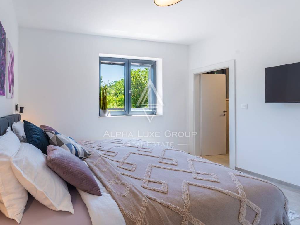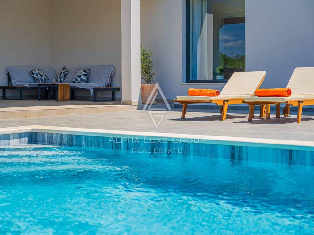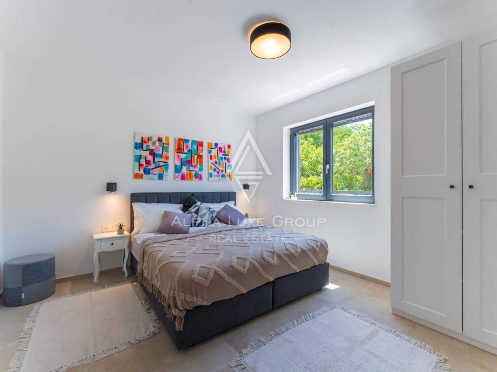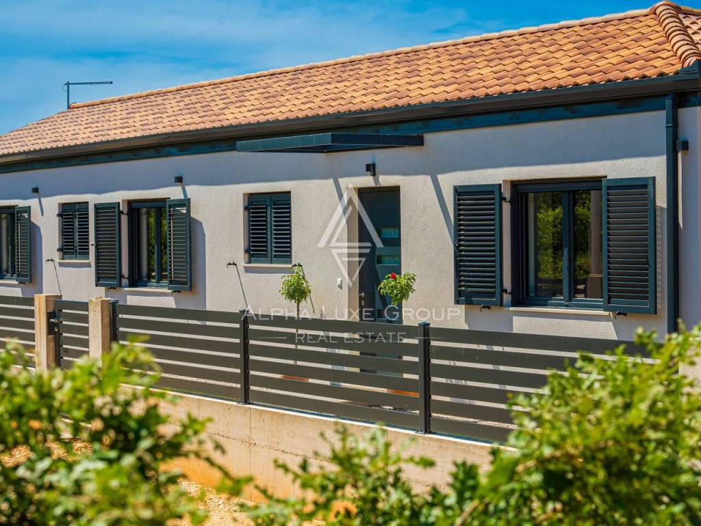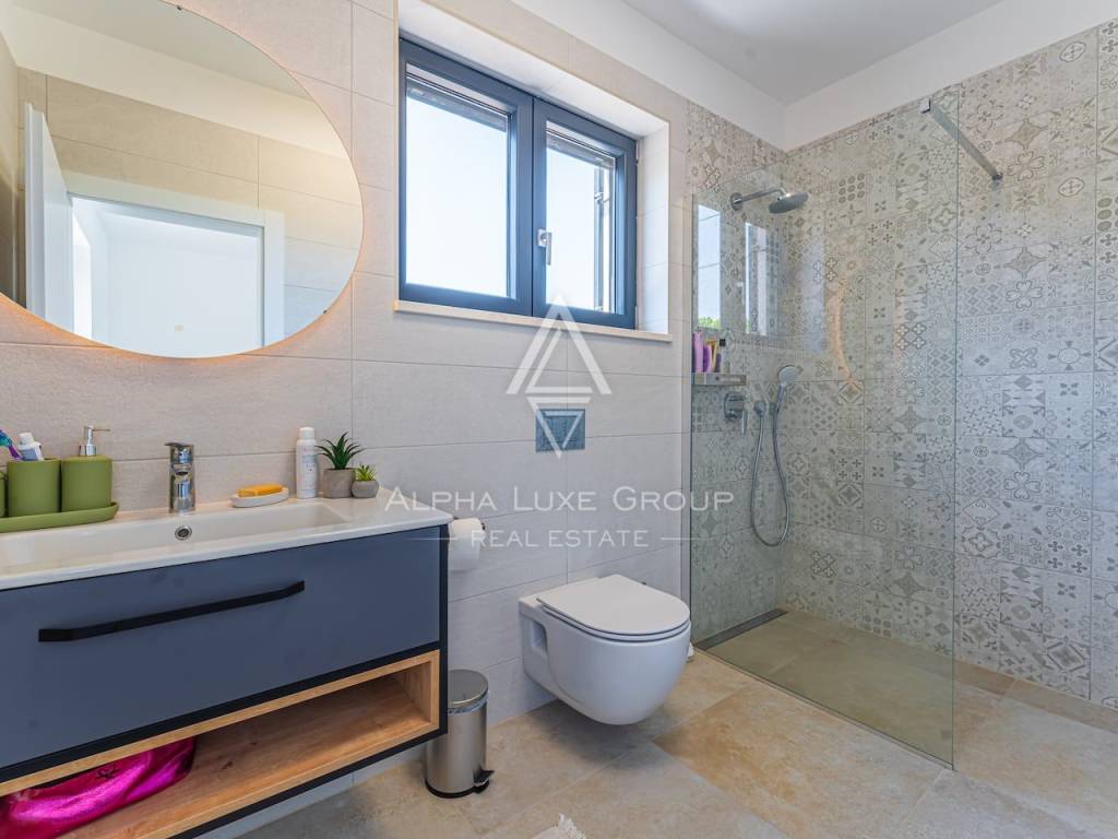 Vanjski prostor pomno je uređen i u potpunosti ograđen, stvarajući privatno okruženje naglašeno mediteranskim krajobrazom. Bazen s prostorom za sunčanje pruža savršeno mjesto za opuštanje, čineći ovu nekretninu izvrsnim izborom za trajni dom ili pametnu investiciju s izvrsnim potencijalom za turistički najam. Bezvremenska arhitektura prirodno se uklapa u okolinu i jamči dugoročnu vrijednost i estetsku privlačnost.
