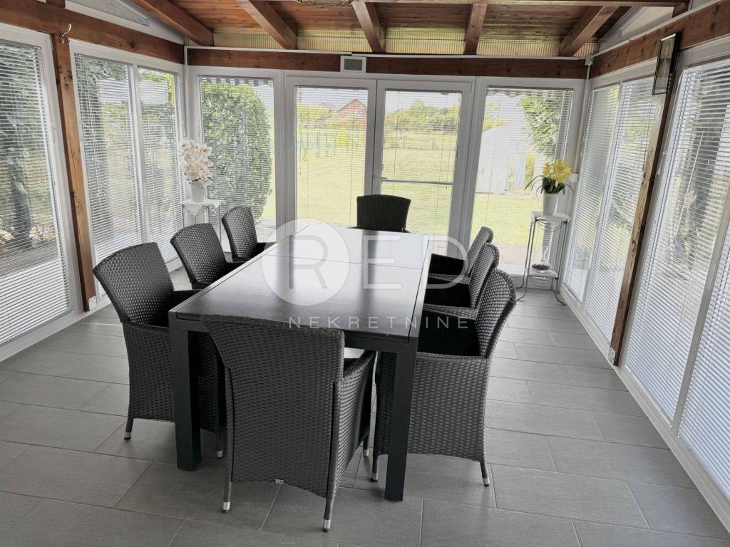 Prizemlje se sastoji od kuhinje s blagovaonicom iz koje se izlazi na ugodnu zatvorenu terasu s klima uređajem, od dnevnog boravka, hodnika, kupaonice, spavaće sobe, dodatne prostrane prostorije (trenutno uređena kao još jedna kuhinja ) i ulaznog prostora.
