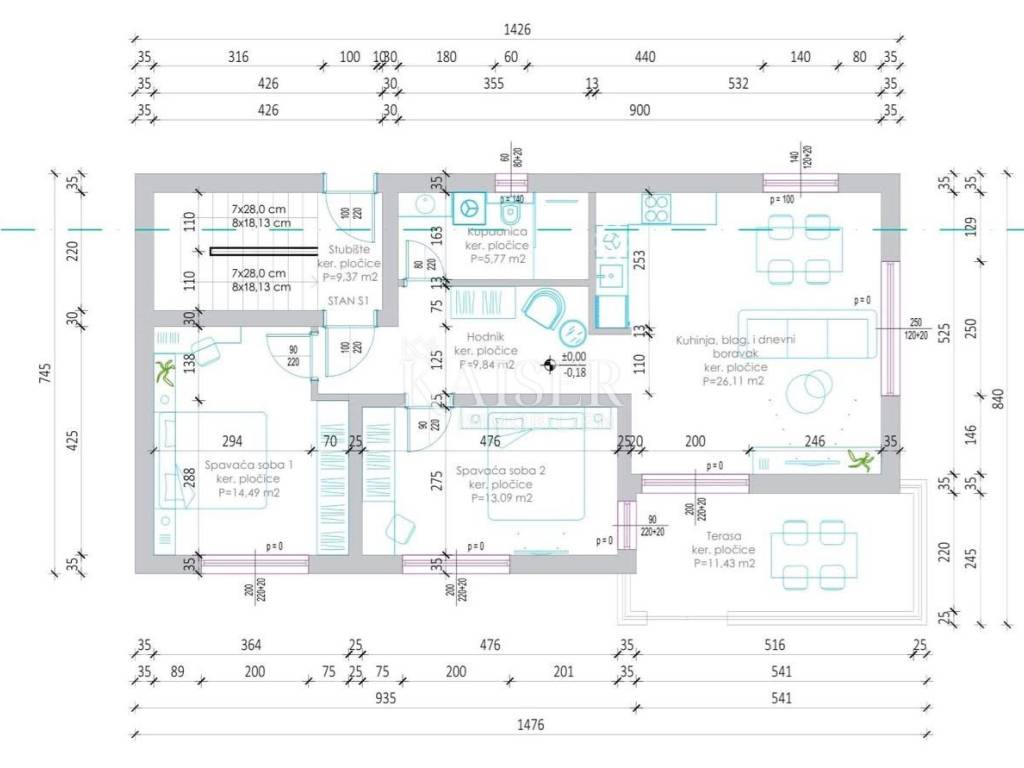 Stan se prodaje kompletno namješten, s kvalitetno opremljenom kuhinjom i Bosch kućanskim aparatima, perilicom i sušilicom rublja, kvalitetnim krevetima, madracima te cjelokupnim modernim namještajem. U svim prostorijama ugrađene su inverter klima jedinice, koje osiguravaju ugodnu temperaturu tijekom cijele godine. Nekretnina je idealna za trenutno planiranje korištenja ili turističkog najma, s obzirom na to da je planirani završetak gradnje i useljenje u lipnju 2026. godine. U ovoj fazi postoji mogućnost korekcije cijene u slučaju kupnje stana bez namještaja, odnosno ako kupac želi samostalno urediti interijer.