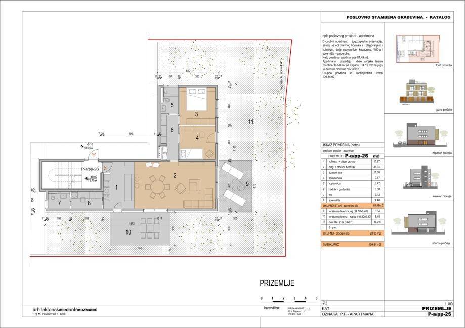 • Obračunska površina stana: 109,84 m² (zatvoreni dio 81,49 m² + terase 30,30 m²)