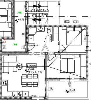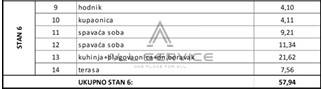 Stan se sastoji od hodnika, dvije spavaće sobe, kupaonice s wcom, dnevnog boravka s kuhinjom i blagavaonom i lijepe prostrane terase.