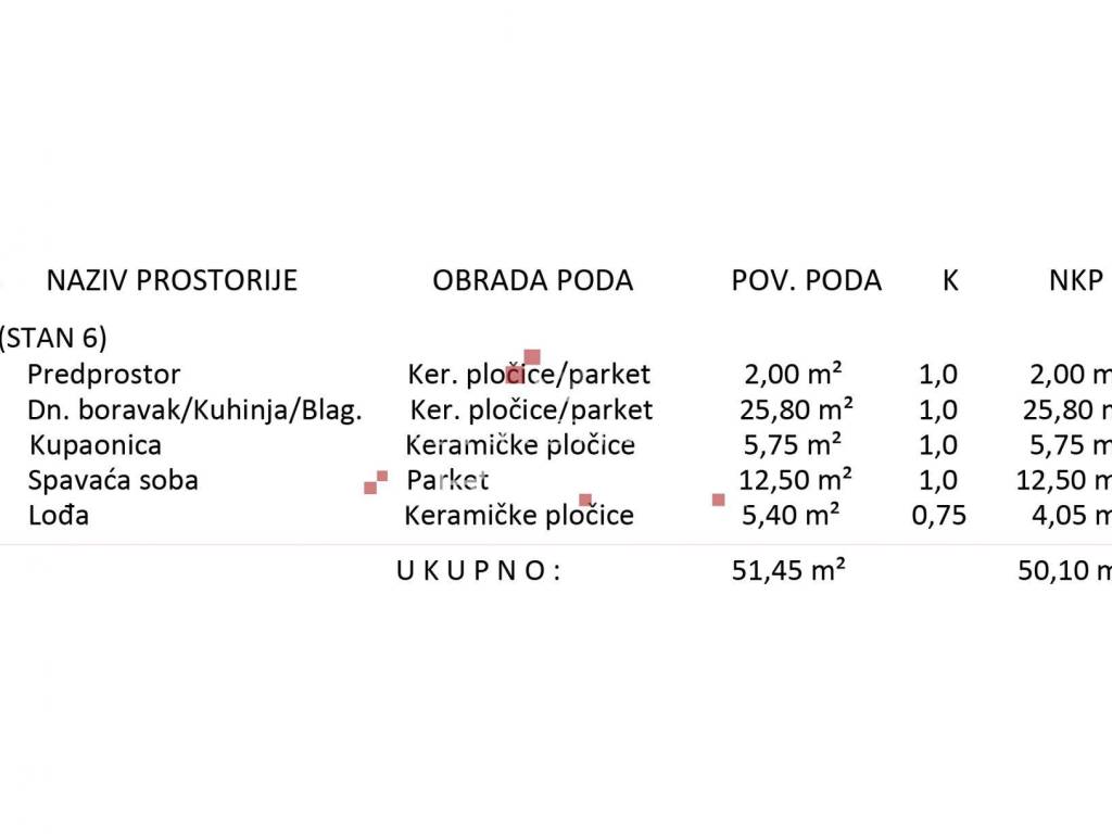 Ukupna stvarna površina stana iznosi 51.45 m2, neto korisna površina (NKP) iznosi 50.10 m2, sa opremljenošću po principu „ključ u ruke“, koja uključuje: