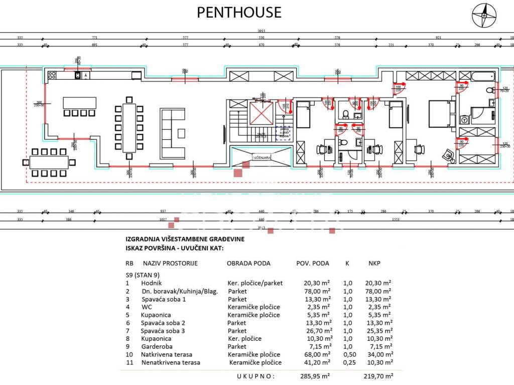 VRHUNSKI penthouse ukupne površine 285.95 m2 i neto korisne površine 219.70 m2 u potpunoj privatnosti uvučenog kata stambene zgrade, sa dizalom koje vodi direktno u stan (pristup preko ključa), pažljivo promišljenog rasporeda: komforni open space prostor sa kuhinjom, blagovaonicom i dnevnim boravkom (78 m²) koji izlazi na prostranu terasu sa pečenjarom, sa velikom glavnom spavaćom sobom (25.35 m²) koja ima vlastitu kupaonicu (tuš i kada) sa WC-om i sobu za garderobu, dok druge 2 spavaće sobe imaju izlaze u zajedničku kupaonicu s WC-om.