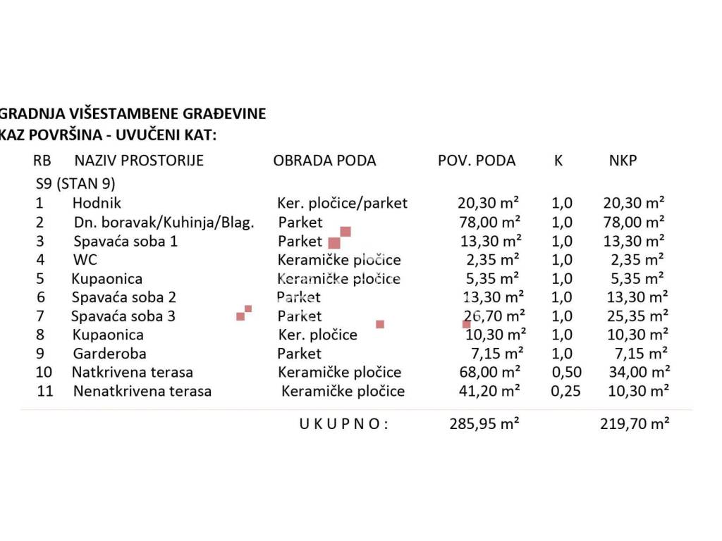 Ukupna stvarna površina iznosi 285.95 m2, dok neto korisna površina (NKP) iznosi 219.70 m2, sa opremljenošću po principu „ključ u ruke“, koja uključuje: