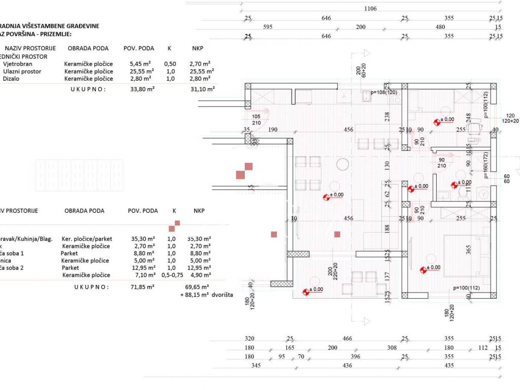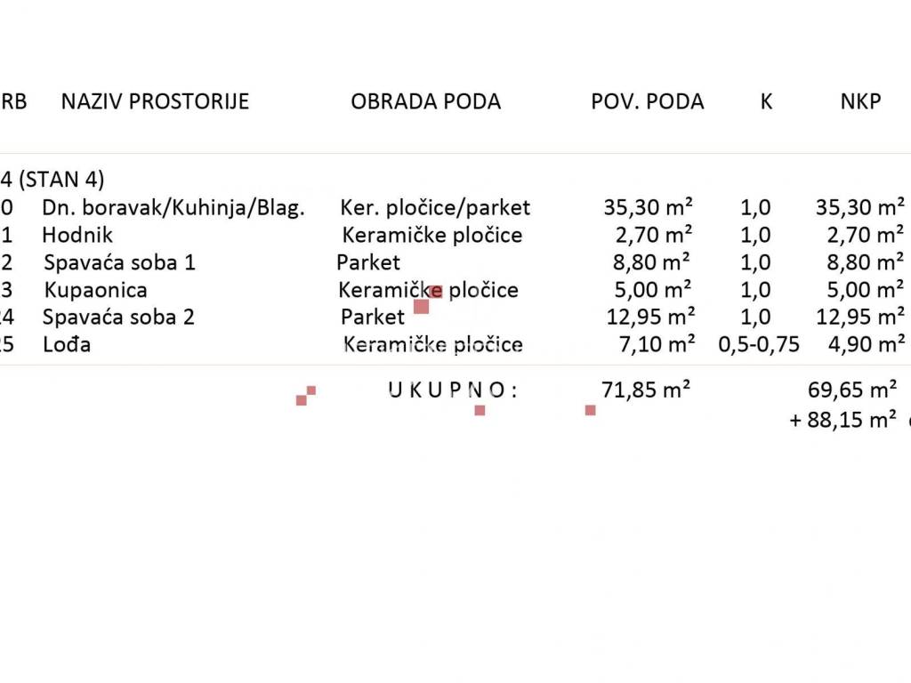 Ukupna stvarna površina stana iznosi 71.85 m2, neto korisna površina (NKP) iznosi 69.65 m2 + pripadajuće dvorište/ vrt površine 88.15 m2!