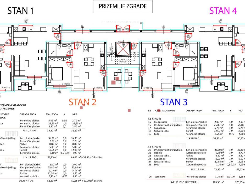 • STANOVI U PRIZEMLJU DOBIVAJU I ZEMLJIŠTE (koje je ograđeno visokom, punom ogradom i posađena trava, odnosno po dogovoru)!