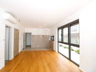 Stan se prostire na dvije etaže. Prizemlje se sastoji od ulaznog prostora, kuhinje s blagovaonicom te vrlo praktične ostave u kojoj se nalazi veliki bojler i koja je koncipirana kao vešeraj, s pripremljenim priključcima za perilicu rublja. Dnevni boravak ima veliku staklenu stijenu s direktnim izlazom na natkrivenu terasu površine 4 m² te na okućnicu od približno 120 m². Na ovoj etaži nalazi se i gostinjski WC.