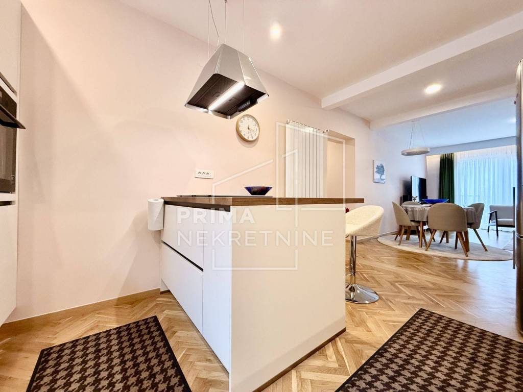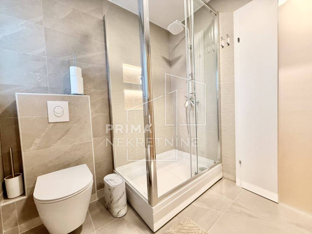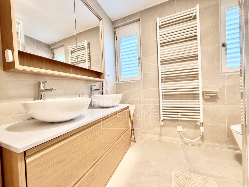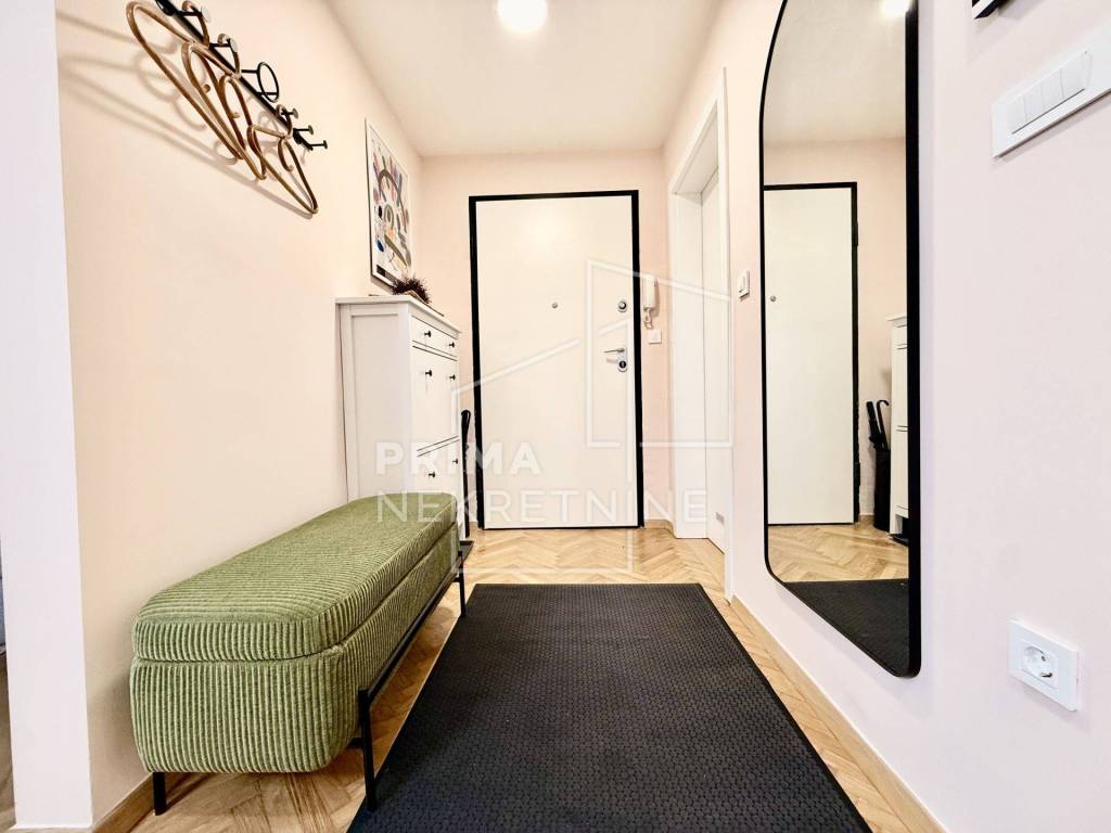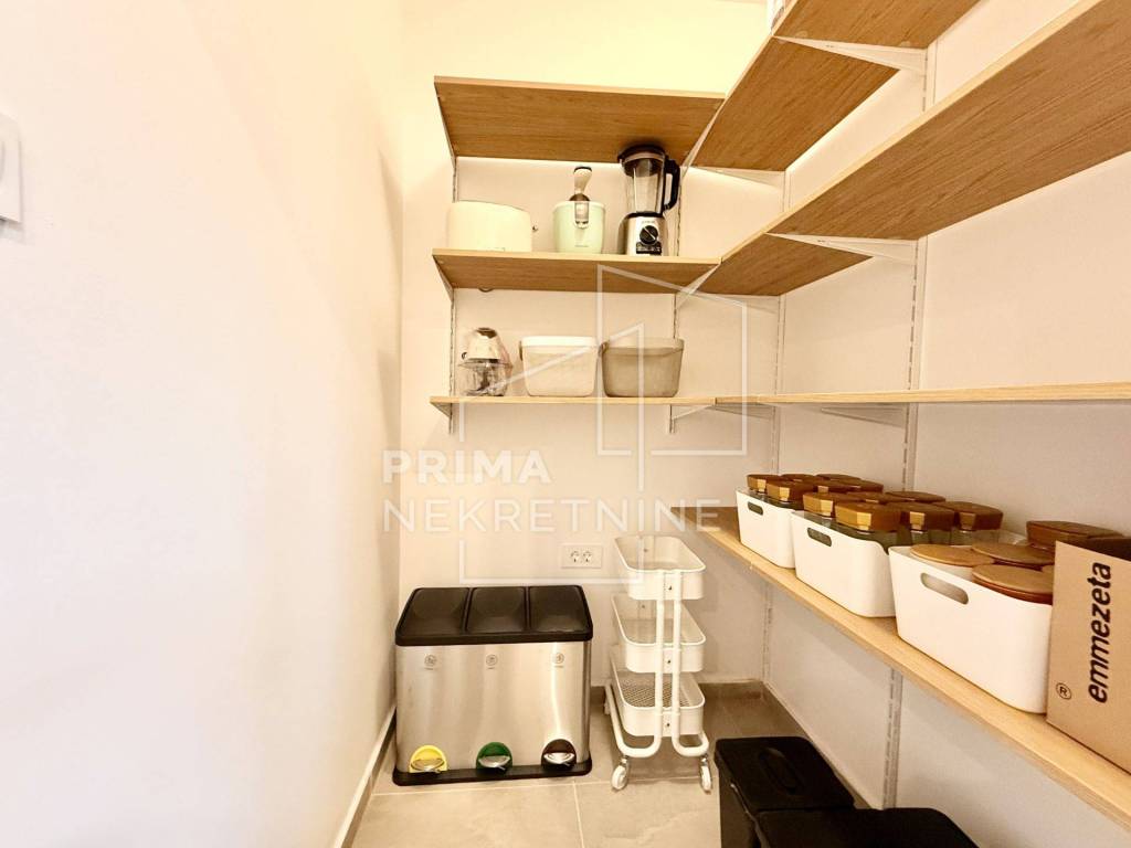 U potpunosti je namješten i opremljen kuhinjskim aparatima (hladnjak, pećnica, perilica posuđa), perilicom rublja, televizorom i klima uređajem. Ugrađena su protuprovalna vrata.