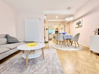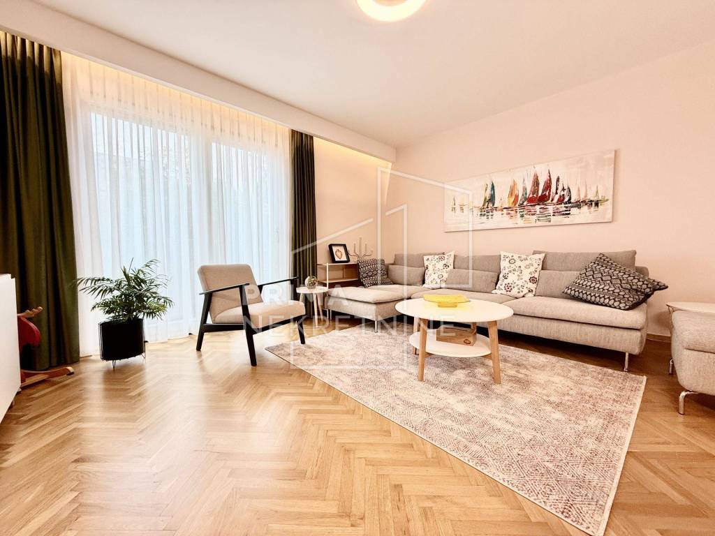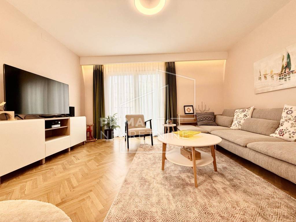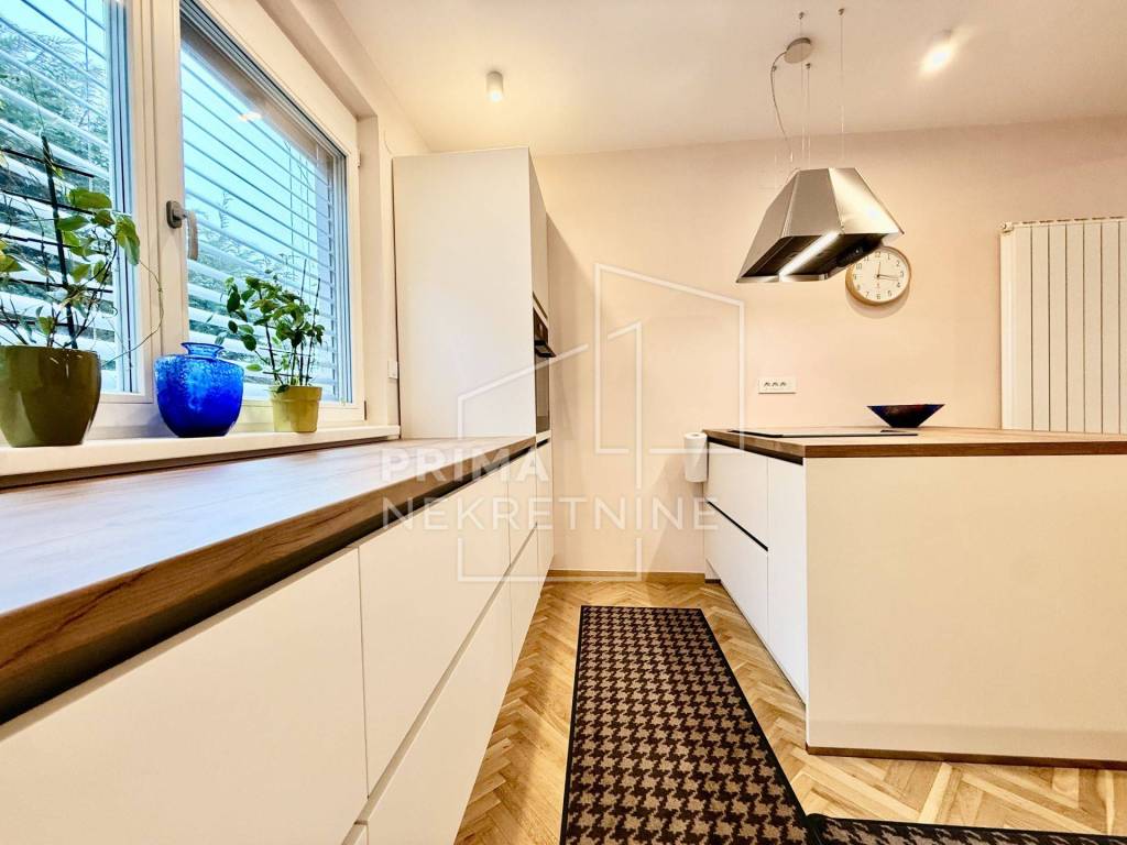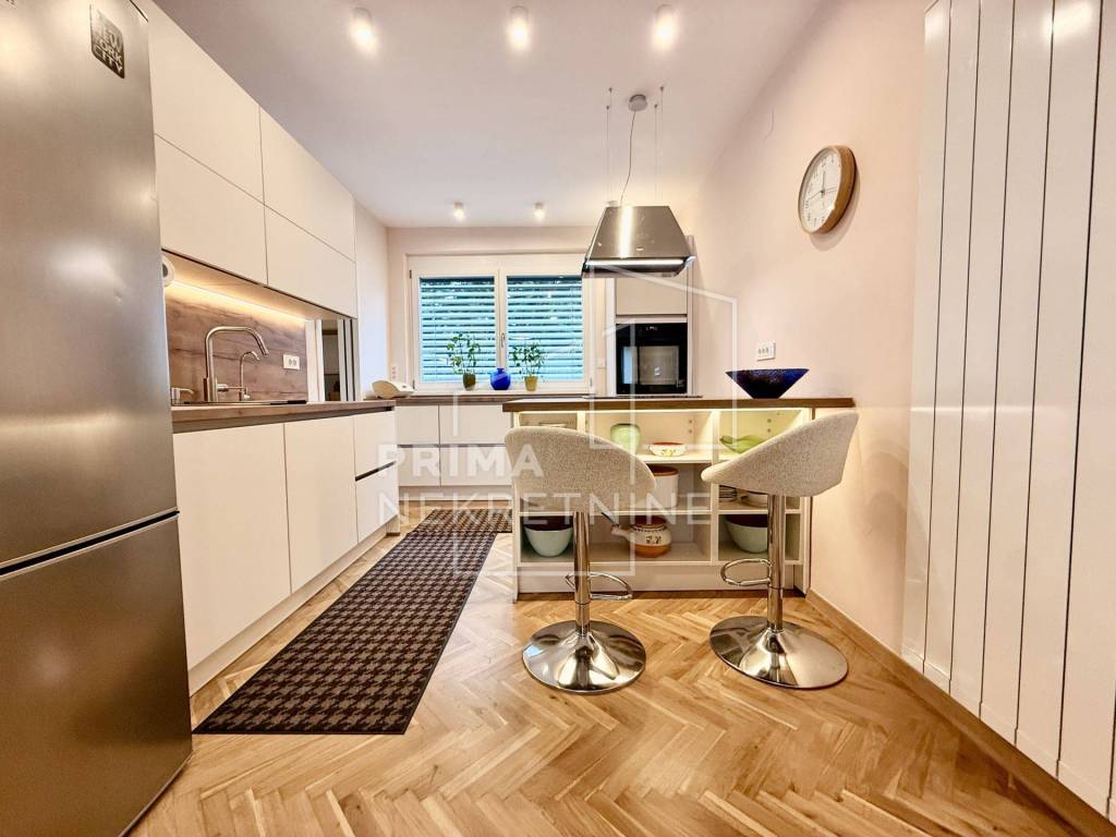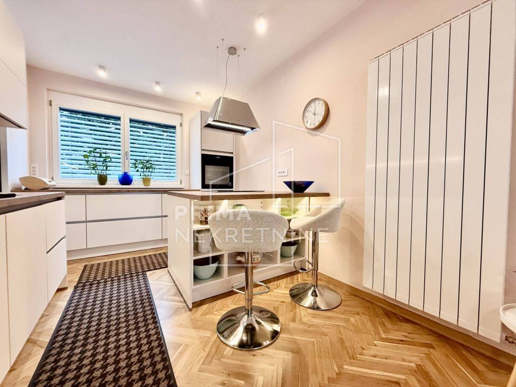 U potpunosti je namješten i opremljen kuhinjskim aparatima (hladnjak, pećnica, perilica posuđa), perilicom rublja, televizorom i klima uređajem. Ugrađena su protuprovalna vrata.