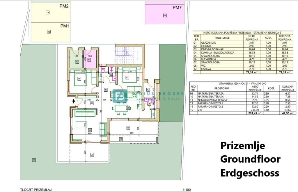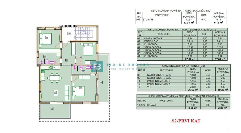 Stan S2 smješten je na 1. katu neto površine 109,22 m2 i sastoji se od: ulaza s hodnikom površine 7.84 m2, dnevnog boravka s pripadajućom kuhinjom i blagovaonicom površine 28.11 m2 s izlazom na natkrivenu terasu površine 10.81 m2 s lijepim pogledom na more, tri spavaće sobe od kojih je jedna komforna master spavaća soba površine 16.38 m2 s vlastitom kupaonicom dok ostale dvije sobe posjeduju površinu od 12.30 m2, odnosno 10.95 m2. Iz master spavaće sobe se izlazi na natkrivenu terasu površine 12.01 m2 s koje se pruža predivan pogled na more i mjesto. Osim navedenog stan posjeduje i zajedničku kupaonicu površine 5.39 m2. Stanu pripada i ostava u prizemlju površine 2.86 m2, te dva parkirna mjesta površine 25 m2, a posebnost ove nekretnine je vrt površine 28.87 m2 u prizemlju.