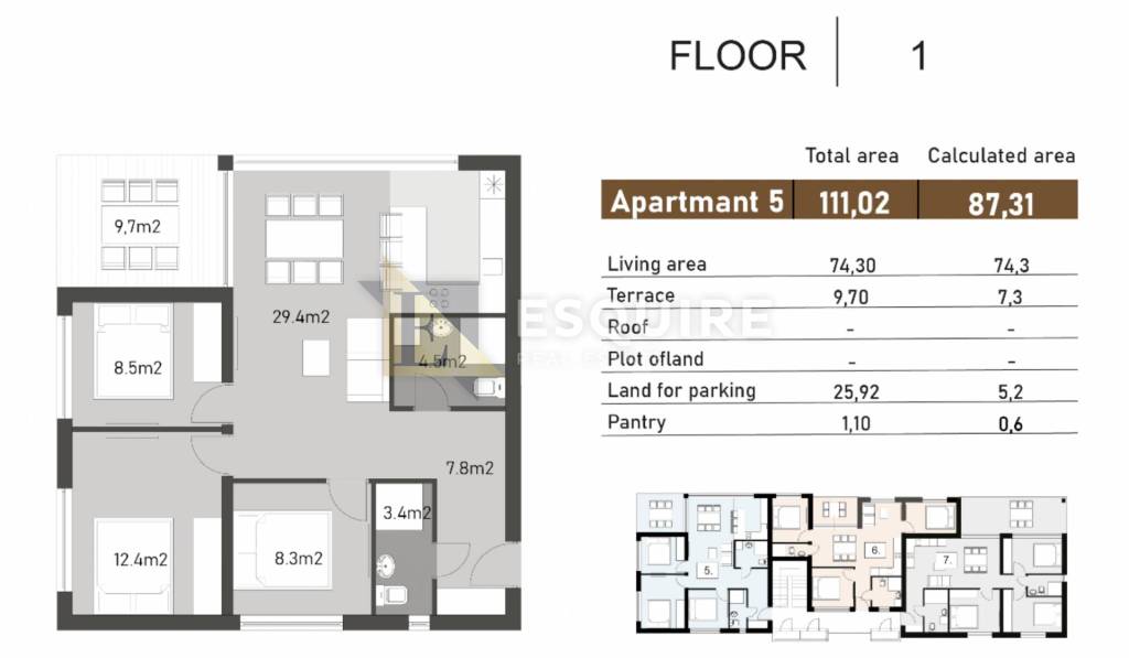 Apartman br. 5 smješten je na 1. katu zgrade i prostire se na ukupno 87.3 m² luksuzno dizajniranog prostora.