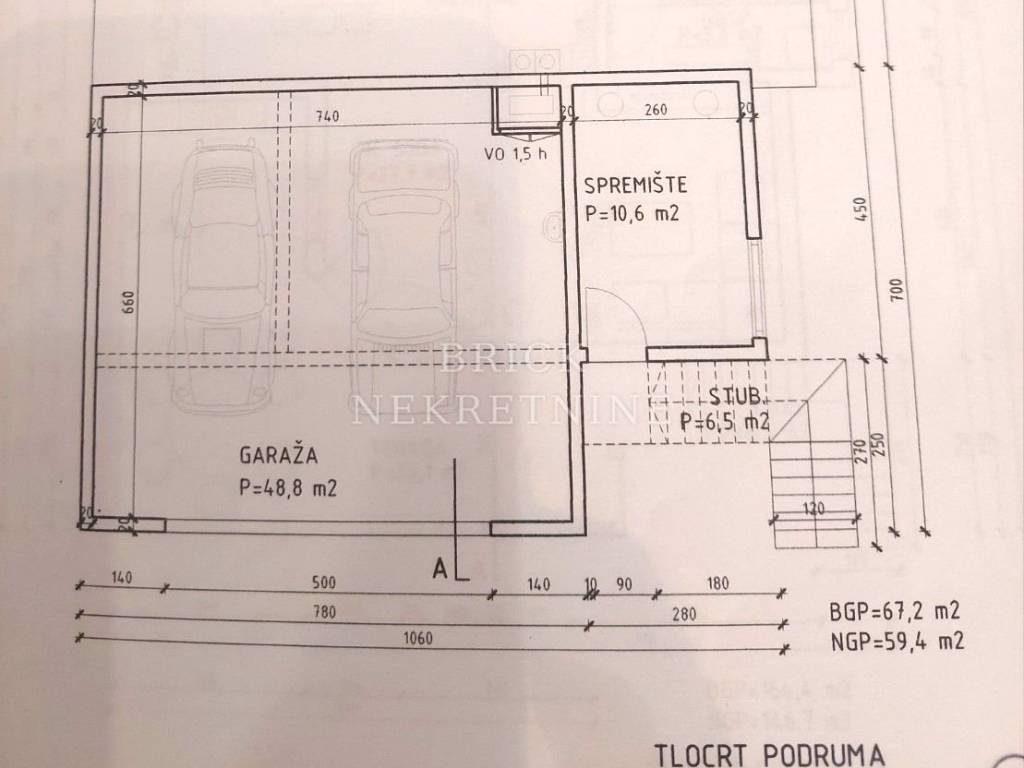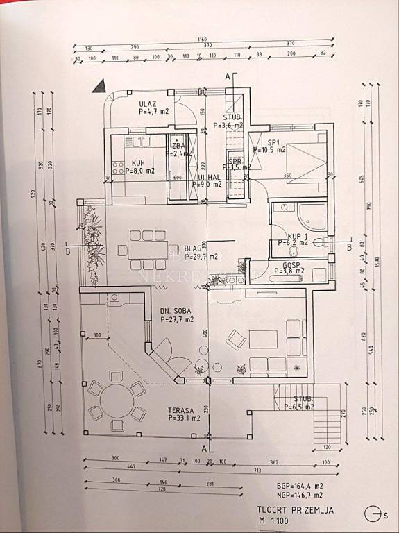 Prizemlje, površine 147 m2: dnevni boravak, kuhinja, blagovaonica, spavaća soba, kupaona, 2 spremišta, terasa
