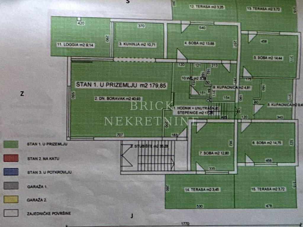 Terase ukupne podne površine iznose 57 m2, obračunato koeficijentom (15 m2) te pridodano ukupnoj kvadraturi stana.