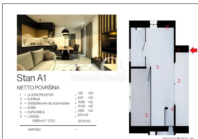 Stan A1 – prvi kat | 1,5-sobni | 43,41 m²