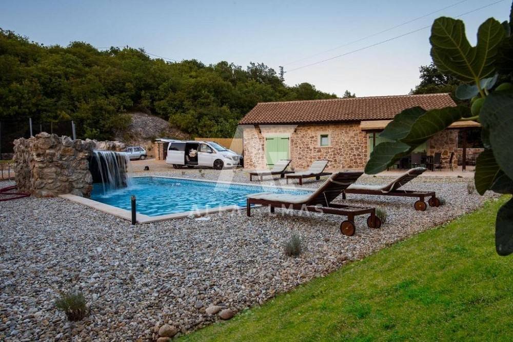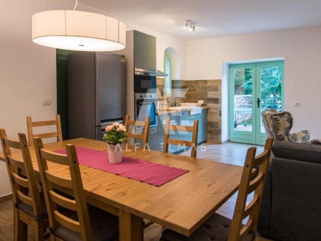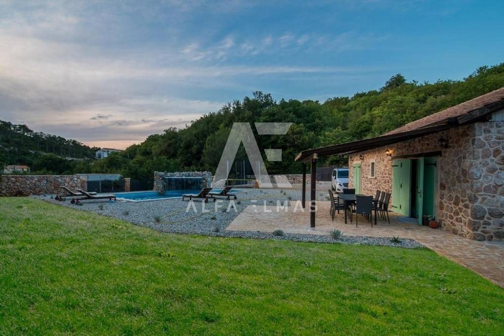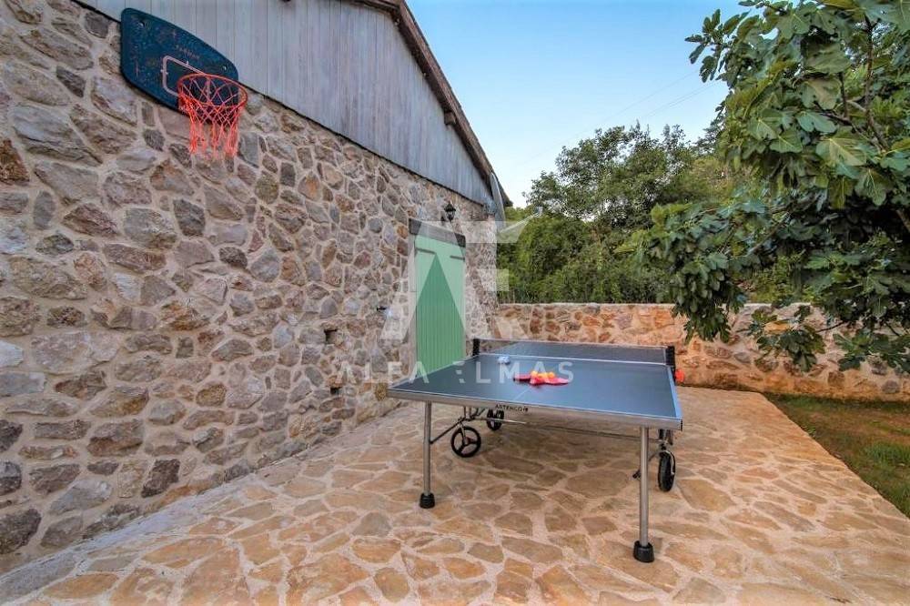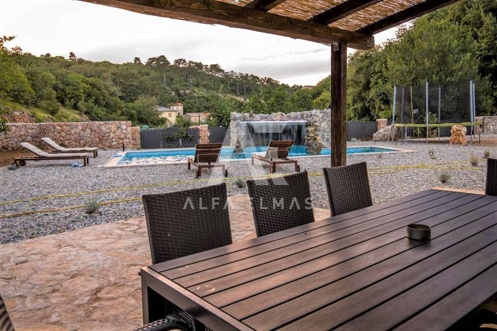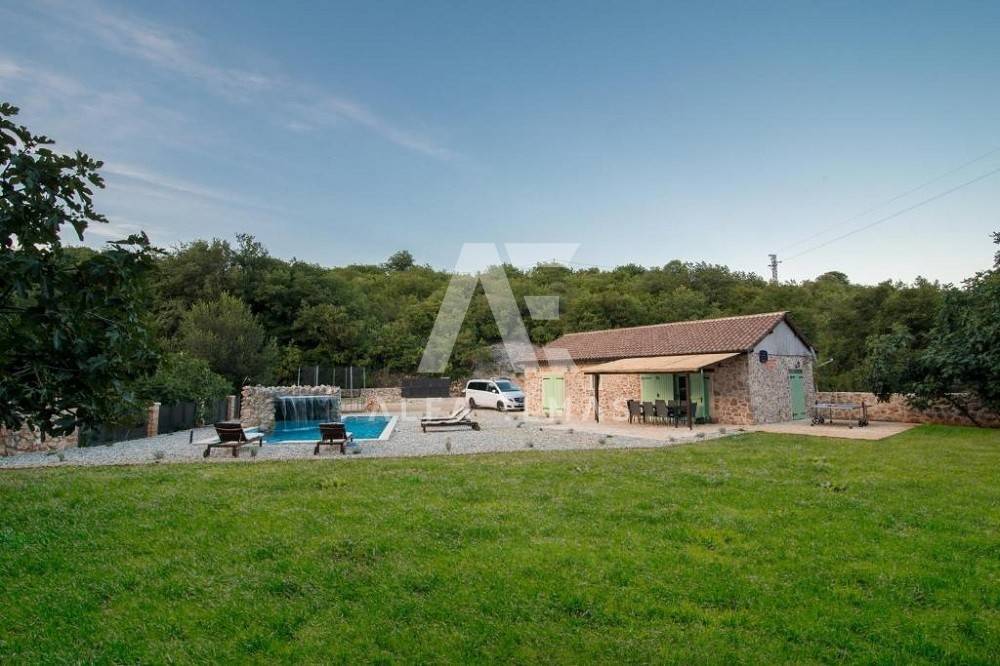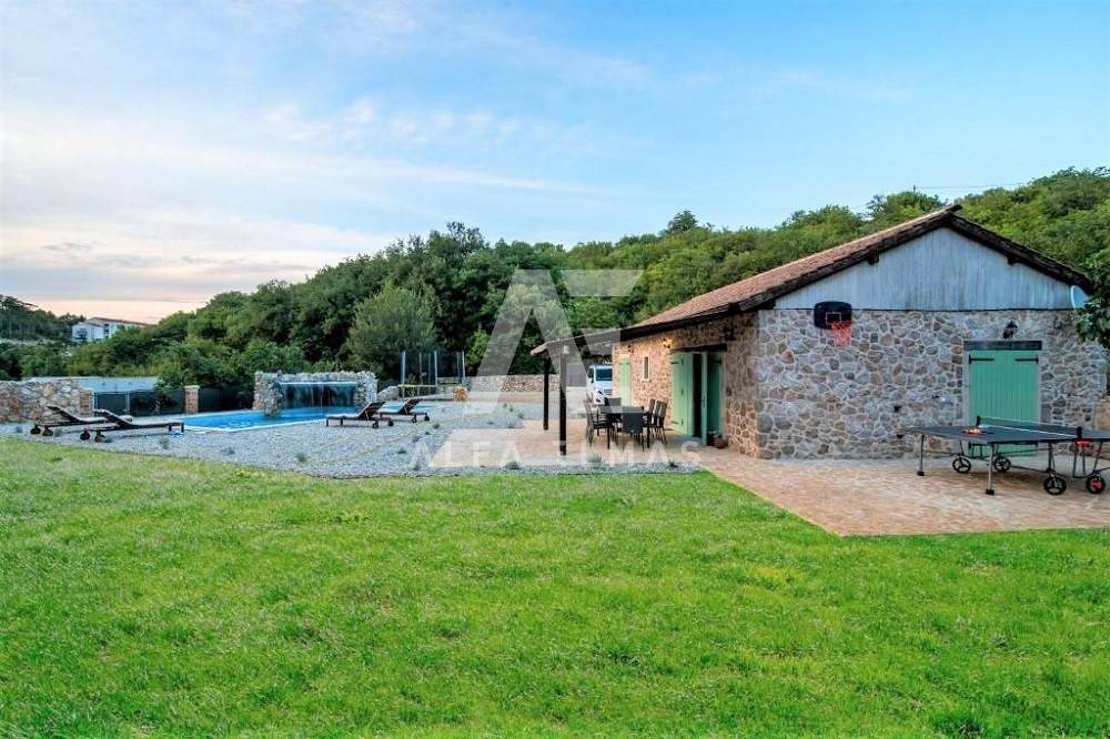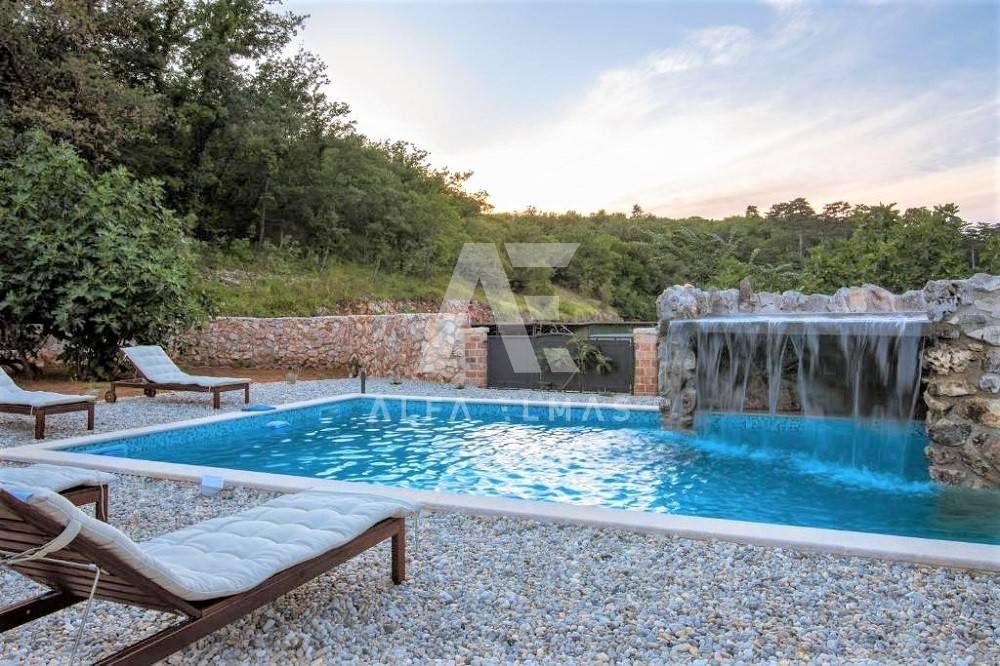 Vrbnik, samostojeća adaptirana kamena kuća stambene površine od 90m2 sa bazenom i predivnom prostranom okućnicom od 3000m2 u cijelosti renovirana 2018 godine. Kamena kuća-prizemnica se sastoji od ulaznog prostora, dnevnog boravka, blagovaone i kuhinje objedinjene u jedan komforan prostor s koje se pruža izlaz na vanjsku natkrivenu terasu i okućnicu na kojoj se nalazi bazen sa vodopadom i sunčalištem. Kamena kuća u ima dvije spavaće sobe, dvije kupaone i wc. U opremu kuće u blizini Vrbnika se ubrajaju drvena stolarija, kvalitetne sanitarije, vrhunska oprema u kupaonicama, sat TV, bazen popločen staklo keramičkim mozaik pločicama, bazenskom tehnikom i rasvjetom. Na prostranoj uređenoj okućnici se nalazi četiri parkirna mjesta. Kamena kuća je vrlo atraktivna za turističku djelatnost, nalazi se na rubu zelene zone u blizini Vrbnika, u potpunoj tišini sa divnim pogledom na zeleni pojas, od mora udaljena svega 700m.