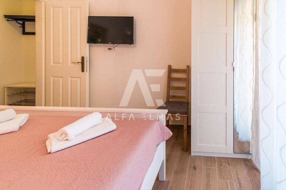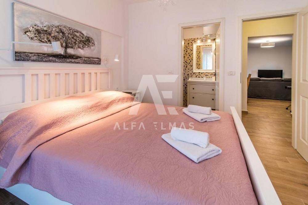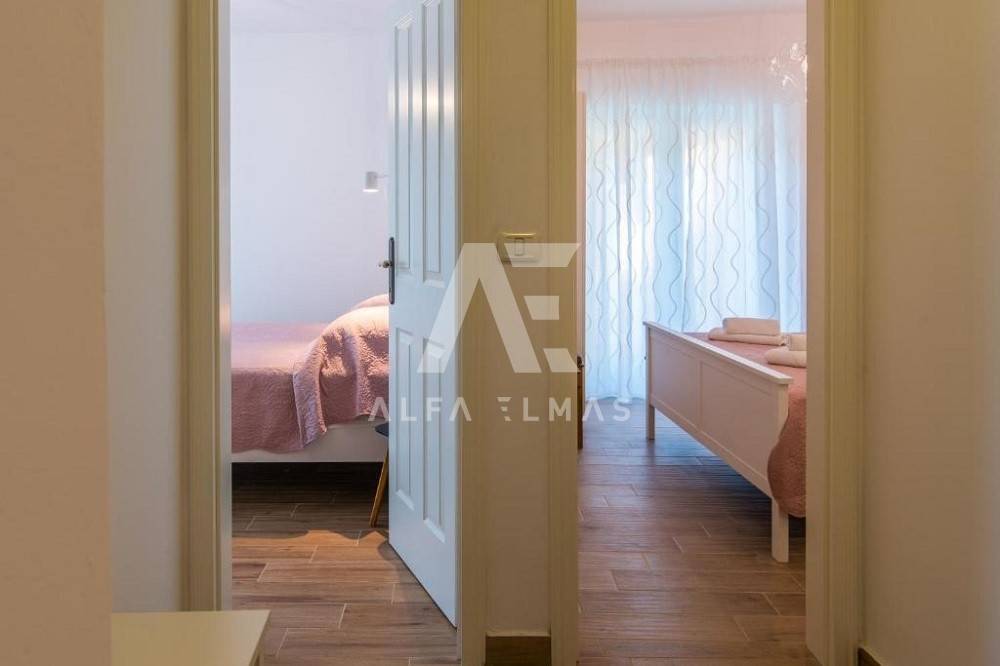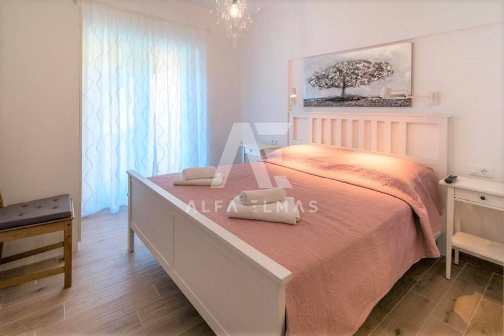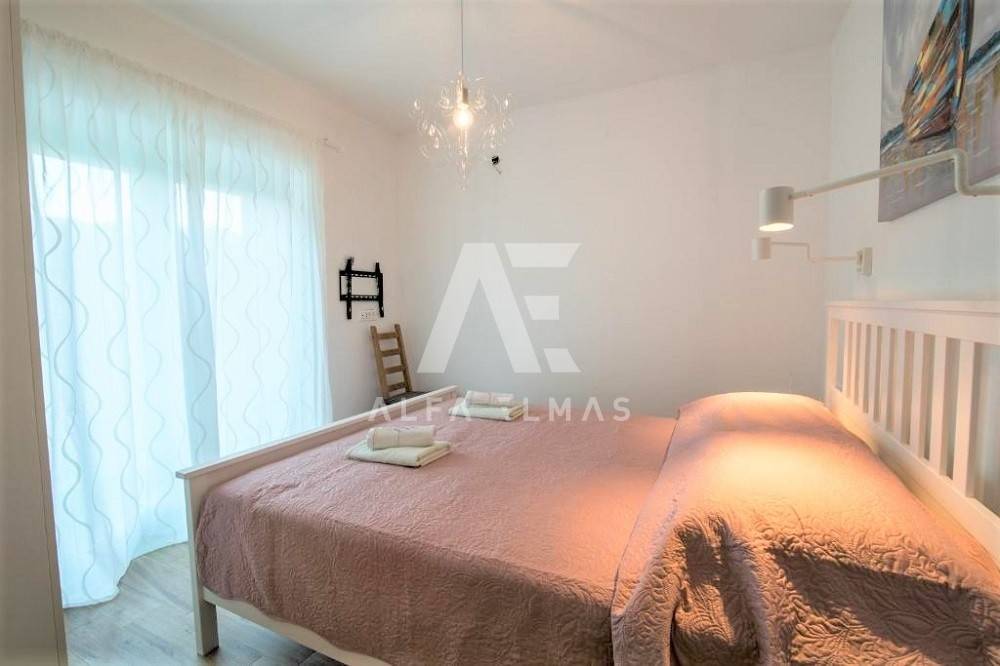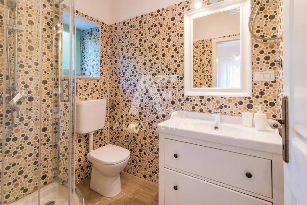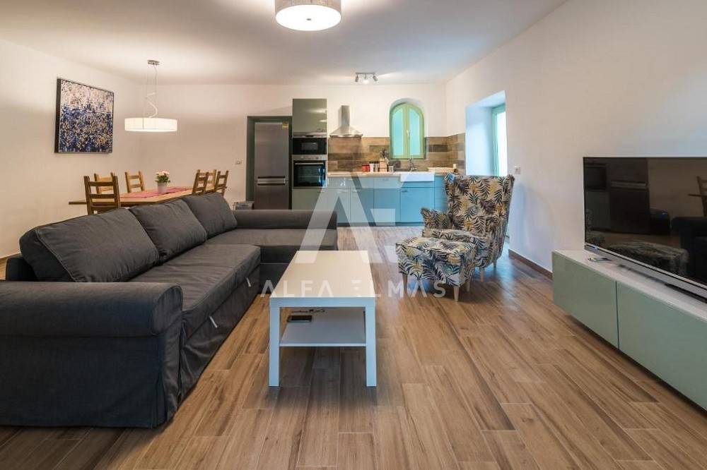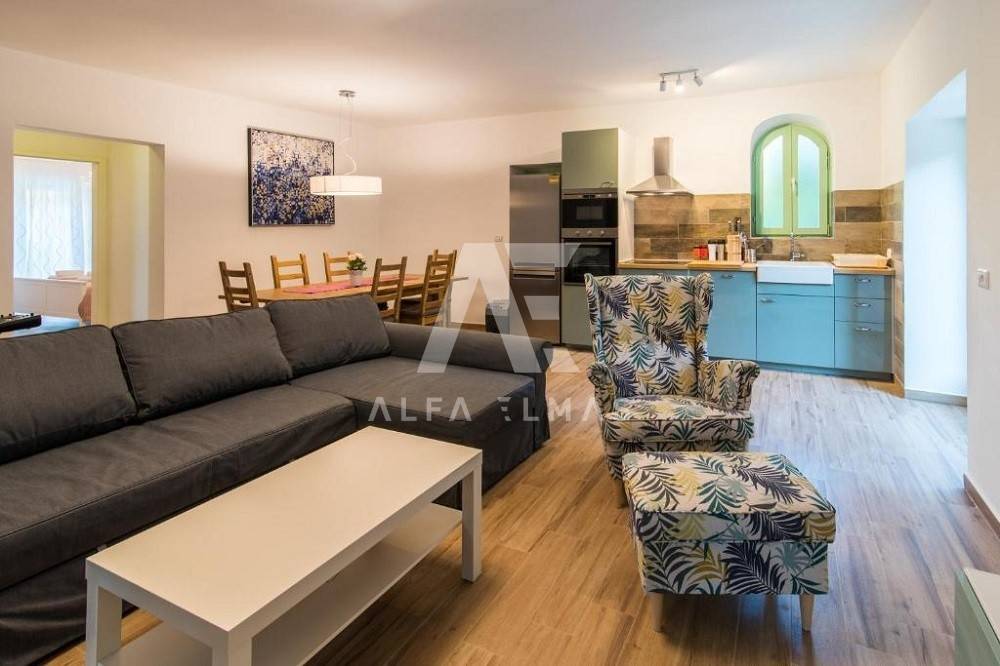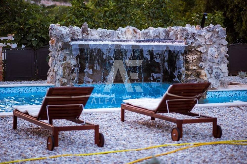 Vrbnik, samostojeća adaptirana kamena kuća stambene površine od 90m2 sa bazenom i predivnom prostranom okućnicom od 3000m2 u cijelosti renovirana 2018 godine. Kamena kuća-prizemnica se sastoji od ulaznog prostora, dnevnog boravka, blagovaone i kuhinje objedinjene u jedan komforan prostor s koje se pruža izlaz na vanjsku natkrivenu terasu i okućnicu na kojoj se nalazi bazen sa vodopadom i sunčalištem. Kamena kuća u ima dvije spavaće sobe, dvije kupaone i wc. U opremu kuće u blizini Vrbnika se ubrajaju drvena stolarija, kvalitetne sanitarije, vrhunska oprema u kupaonicama, sat TV, bazen popločen staklo keramičkim mozaik pločicama, bazenskom tehnikom i rasvjetom. Na prostranoj uređenoj okućnici se nalazi četiri parkirna mjesta. Kamena kuća je vrlo atraktivna za turističku djelatnost, nalazi se na rubu zelene zone u blizini Vrbnika, u potpunoj tišini sa divnim pogledom na zeleni pojas, od mora udaljena svega 700m.